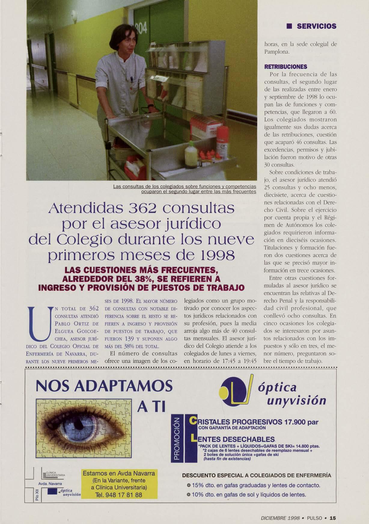 Asim ismo , se da el caso De los 478 colegiados de 37 profesionales de que viven en área de in- Enfermería pertenecientes fluencia de la sede de Tu- al Colegio de Navarra que deJa , 357 están encua- tienen su residenc ia fuera drados en localidades de de la Comunidad Foral. En la zona sanitaria de Tude- La Rioja suman 18 los cola. Se trata de Tudela, legiados de Alfaro, LogroFustiñana, Fitero, Cabani- ño, Al canadre , Rincón de llas, Cortes, Lodosa, Soto y Arnedo. Otros 13 viMonteagudo, Cadreita, ven en las localidades araLazagurría, Cintruénigo, gonesas de Zaragoza, Ejea San Adrián, Ablitas, Aza- de los Caballeros, San gra, Buñuel, Cárcar, Men- Martín de Moncayo, Taradavia, Sartaguda, Core ll a, zona, Tauste y Santa EnArguedas, Ribaforada, gracia. Por último. en SoMurchante, Fontellas, ría residen 6 colegiados, Cascante, Valtierra y Cas- concretamente en Agreda , tejón. Otros 76 colegia- Soria y Vozmediano.