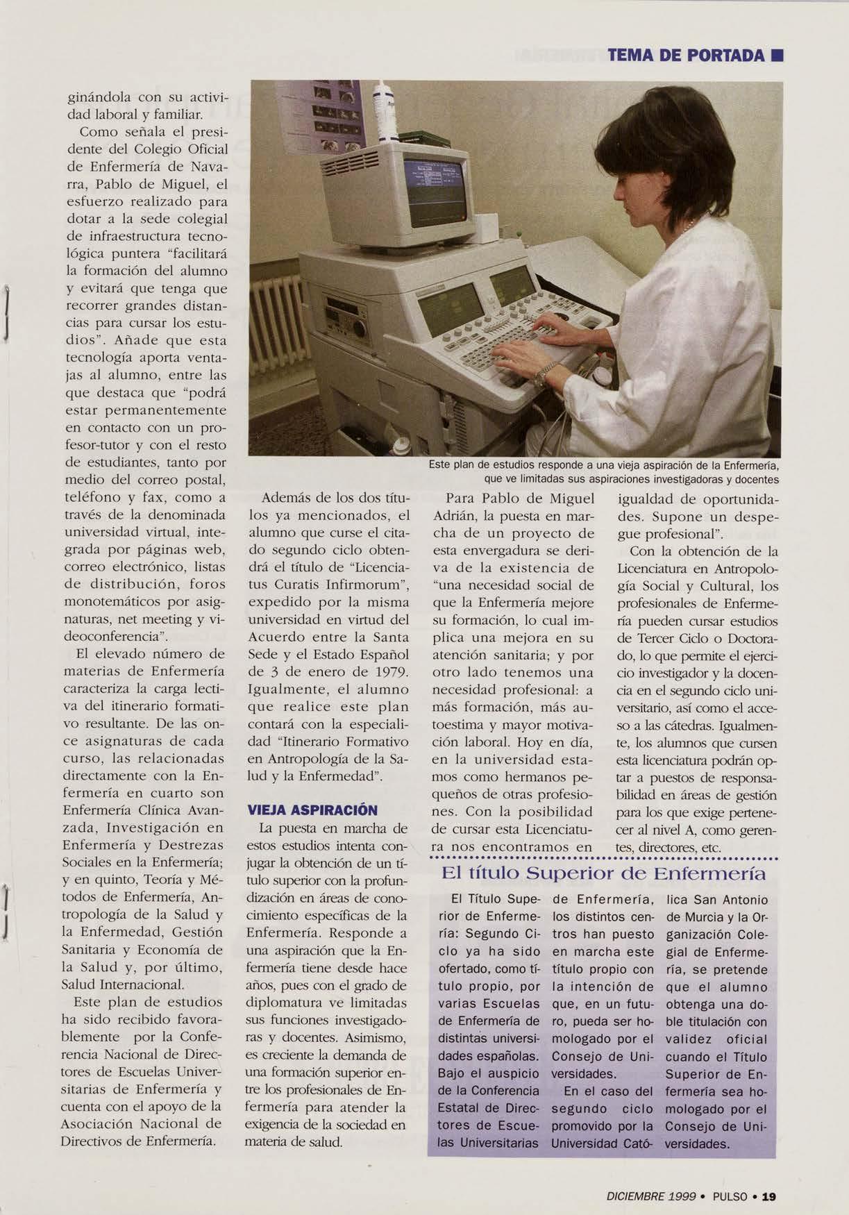 En eJ contexto expuesto, recientemente se ha producido un hecho que reviste una singular importancia: la aprobación del Plan de Esrudios de Segundo Ciclo para la Licenciatura en Antropología Social y Cultural de la Universidad San Antonio de Murcia. lo primero que hay que dejar claro es que no se trata ele la Licenciatura en Enfermería. Es una Licenciatura en Antropo logía. Entonces, si no es •;nuestra licenciatura" y resu lta que ya existen Universidades en las que se imparte la Licencian•ra en Antropología, ¿dónde está el interés de esta nueva lación? La imponancia de esta nueva tirulación para nosotros se centra en los siguientes aspectos: a) al igual que el resto de los planes de estudios impanidos por otras Universidades, la obtención de la referida licenciatura permite el acceso al doctorado, Jo qut: interesa para la actividad docente e investigadora; b) también al igual que el resto de Lict'nciat11ras en Antropología, la posesión de ésta faculla ¡XJra el acceso de puestos de ·nivel A'' para los que se requiere disponer de una licenciatura sin determinar; e) a diferencia del resto de Licenc iatur:ts, ésra se puede cursar en los Co legios Provincia les de Enfermería, Jo que significa que no hace fal ta desplazarse a la localidad donde se encuentra la universidad en cuestión, sino que se acude al Colegio de la Provincia en la que reside el a lumno; d) también a diferencia del resto de licenciaturas en Anu·opología, ésta incluye un importantísimo número de asignaturas que se refieren específicamente a Enfermería, lo qut: significa que si algún día se desan·olla la Licenciatura en Enfermería existirá una mayor facilidad de convalidación de titulaciones que en el caso del resto de licenciaturas. Es evidente que, al no tratarse de la anhelada Licenciatura en Enfem1ería, la titu lación que venimos comentando interesa a 1111 número determinado de compañer@s Oos interesados en la actividad docente, en la investigación o en acceder lt otros puestos de trabajo, quienes se encuentran m paro y por e l coste económico de un master o expeno prefieren obtener una titulación académica oficial. ) Pero también es claro que a medida que vaya aumentando e l número de personas que cursen esta Ucenciatura (u otras parecidas que puedan surgir), se irá creando un importante conjun to de personas cuya existencia servirá sin duda para acercar nuestro objetivo final irrenunciable: la Licenci;1rura en Enfem1ería.