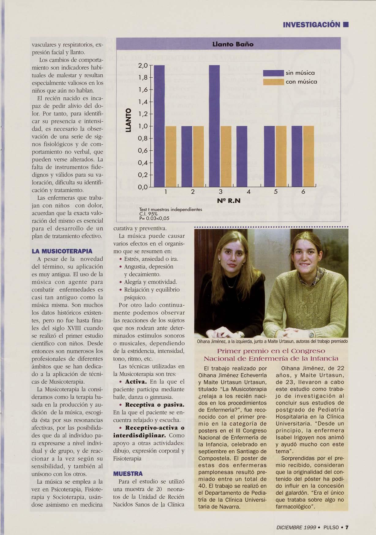 El trabajo rea l izado por Oihana Jimé nez Echeverría y Maite Ur tasun Urtasun , titulado "La M us icoterapia ¿relaj a a los rec ién nacidos en los procedimientos de Enfermería? ", fue reconocido con e l pri m e r prem i o en la categorí a de posters en e l 111 Congreso Nacional de Enfermería de la lr'!fancia , ce lebrado en septiembre en Santiago de Compostela. El poster de estas dos enfermeras pamp lonesas resultó premiado entre un total de 40. El trabajo se real izó en el Departamento d e Ped iatría de la CITnica Un iversitaria de Navarra.