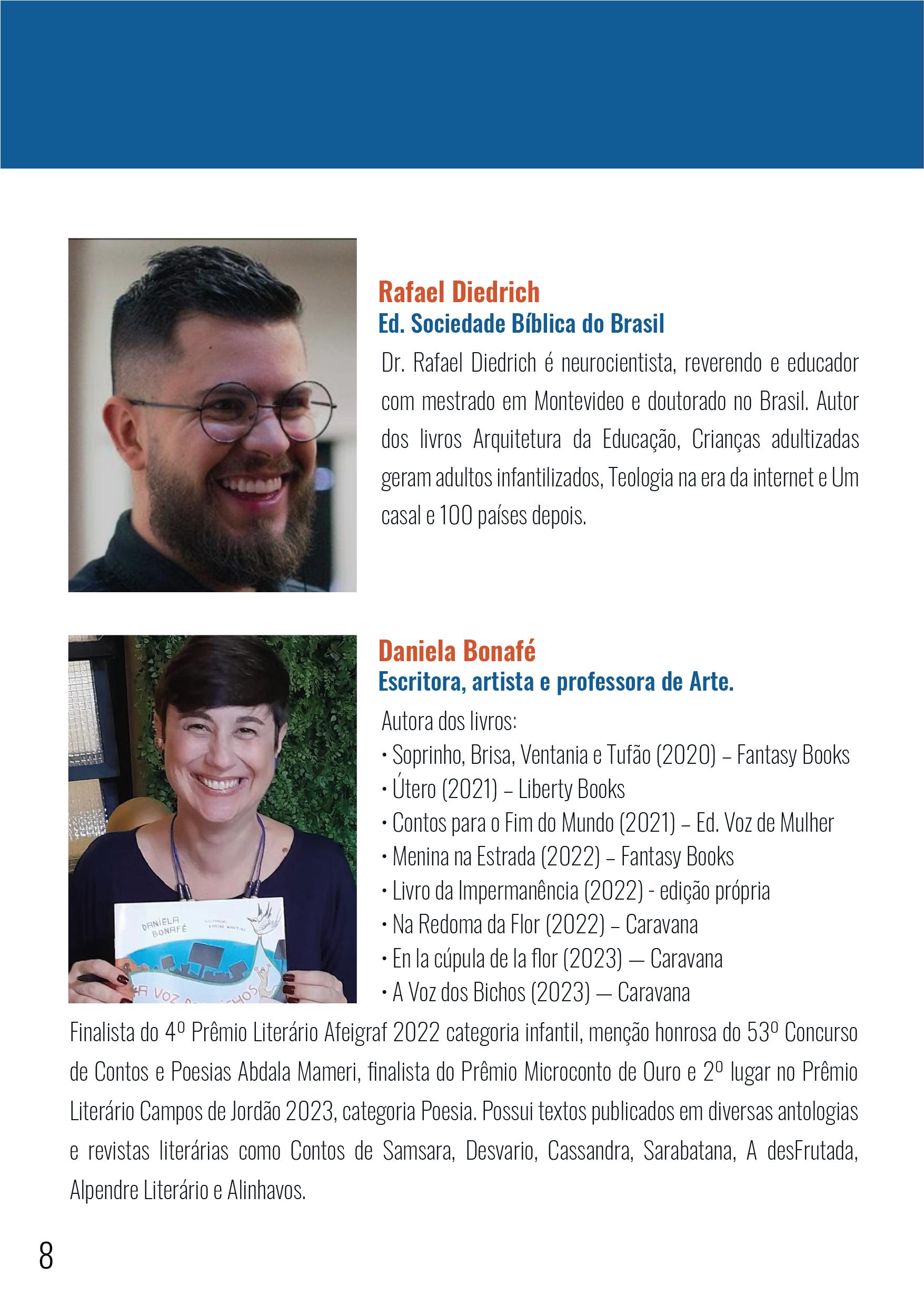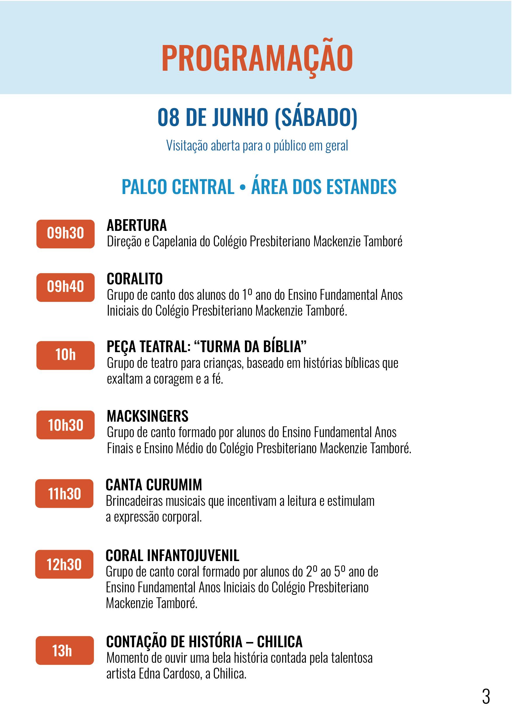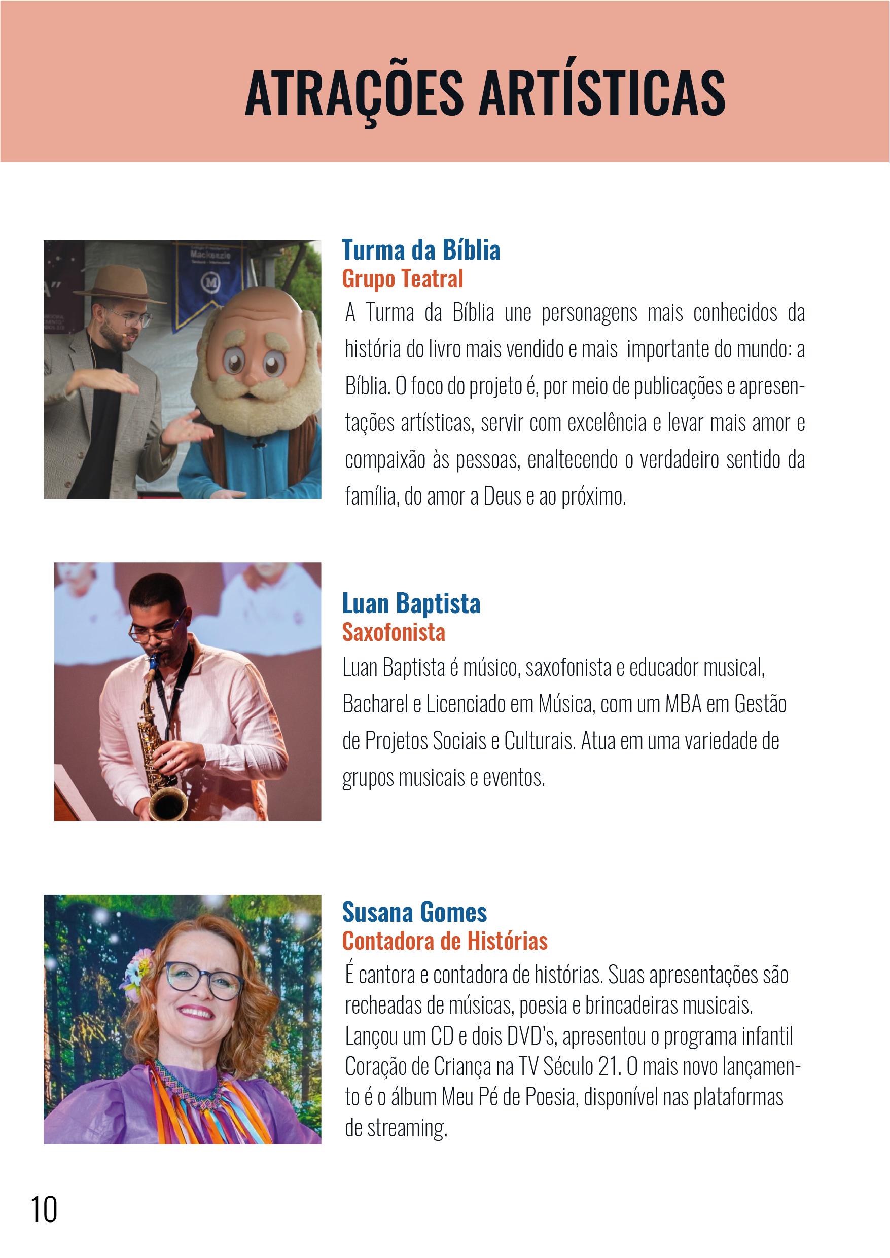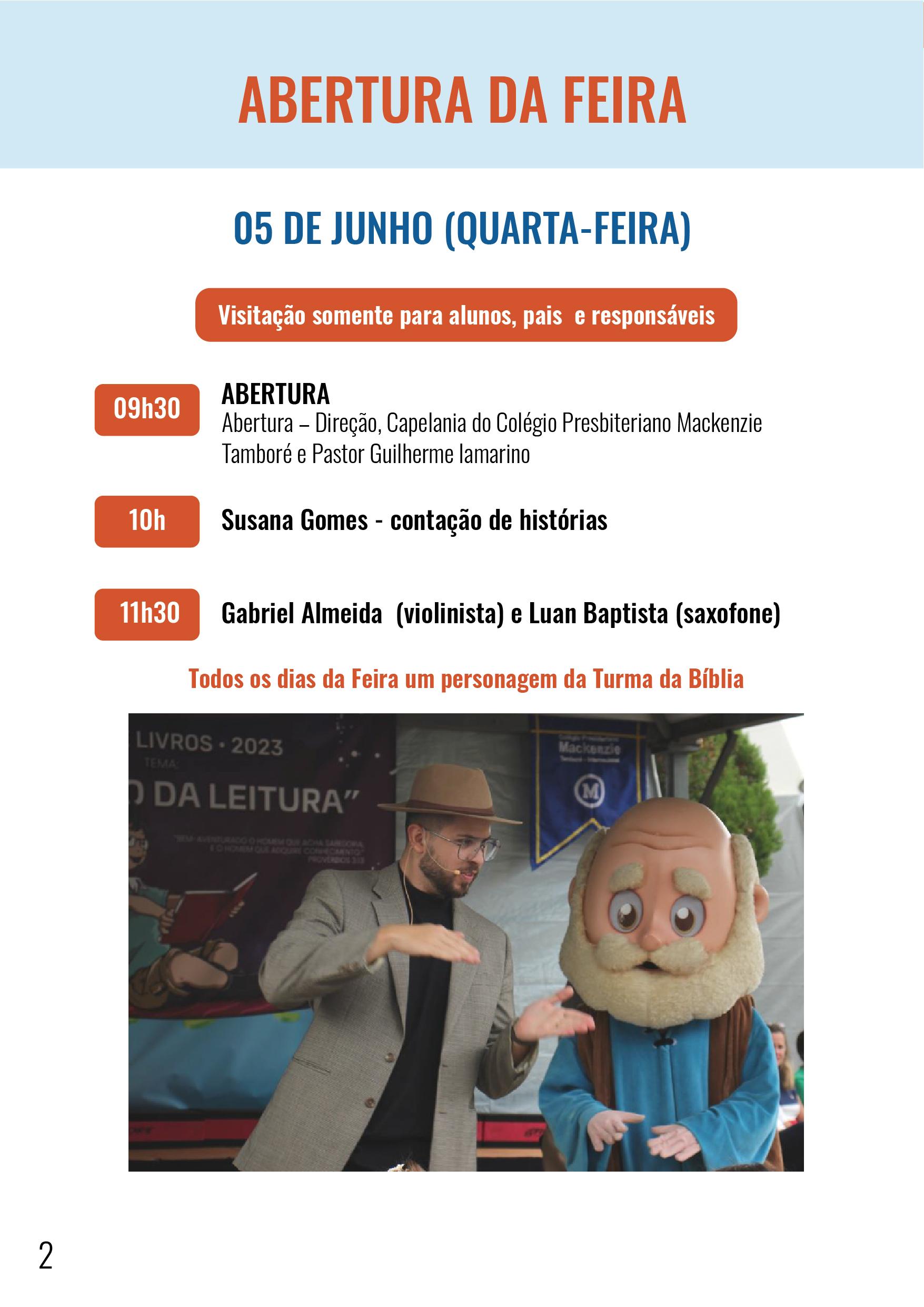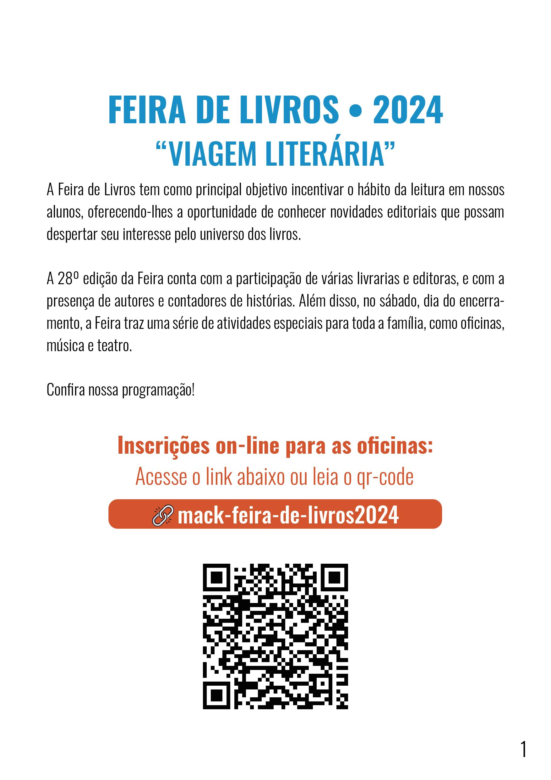 Vem aí a Feira de Livros 2024! Participe desta viagem ao universo da literatura! São quatro dias de oportunidades para que nossos alunos de todos os segmentos conheçam as novidades editoriais e apaixonem-se pelos livros! No sábado, 08.06, a Feira receberá diversos escritores que irão autografar suas obras premiadas e toda a família pode também participar de atividades de música, teatro, contação de histórias e muitas oficinas artísticas.