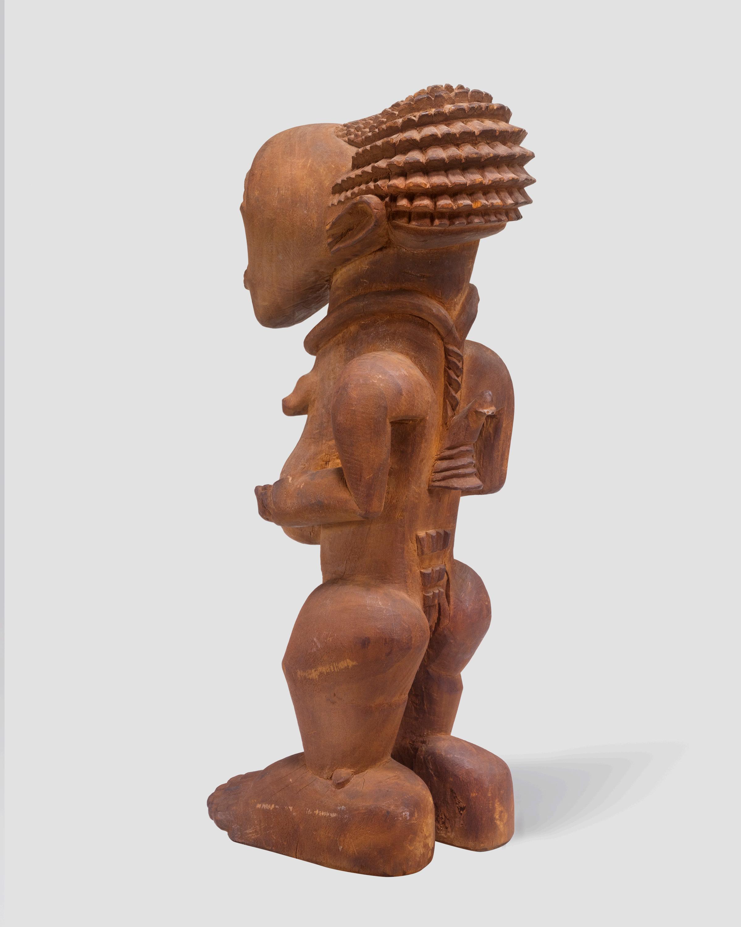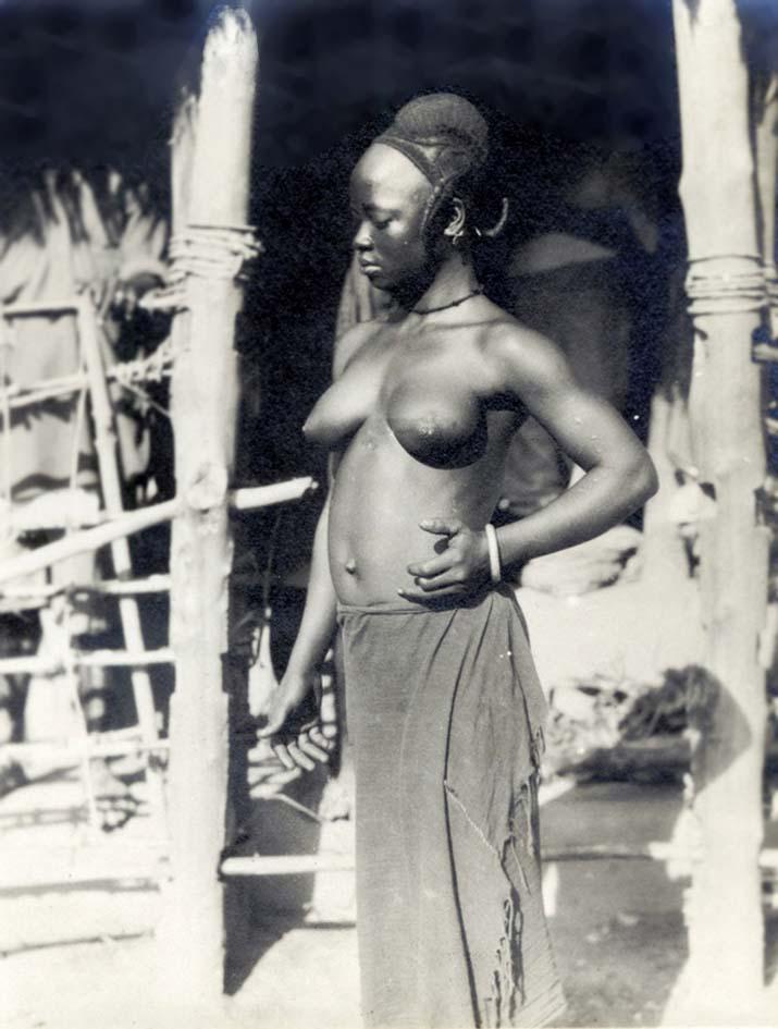 African sculptures often borrow symbolic codes rooted in and referencing their ethnic identity. Among the Baga, this "norm" is not a rule, and we are faced with an exceptional aesthetic aspect, a confirmed curiosity; some of the attributes and ornaments characteristic of the Nimba do not correspond at all to those of Baga women from the past, but rather to those of women from other ethnic groups, more specifically the Fulbe women. By analyzing the photographic documentation from the first half of the 20th century, outside the Baga territory (photographic archives of the Fathers of the Holy Spirit, 1930 and Corrêa, 1943: 371), a remarkable and undeniable similarity appears between the hairstyles of the Fulbe women from Fouta Djallon, those of women from Sierra Leone, and the hairstyle of the Nimba. All of them are composed of a crest split in two, one at the top of the skull, the other plunging towards the front of the forehead, both reinforced by braided tresses. These sophisticated headdresses, sometimes adorned with long extensions extending along the face, could have been represented by the facial scarifications of the Nimba According to Lamp, the double marks on the cheeks indicate a belonging to the Baga ethnic group, referencing the identity of the ancestor who gave birth to generations of Baga children, spiritually and physically nurturing them. Idolized and adored, when she emerged for ceremonial procession, men and women came to pay homage to her, and often in a customary gesture, their hands rested on their chests, affirming their fertility, imploring and showing respect for the nurturing power. This act, this gesture, also endowed the dancer with powerful fertility (Boris Kegel Konietzko, personal communication, 1958). The adoption of the Fulbe aesthetic style in the Nimba statuary, beautifully displayed in this remarkable work, can be considered as an acceptance, a recognition, a distinctive sign of belonging to the conventions of the most privileged status in society. This confirms the prestige of the Nimba as an unattainable tutelary entity, tending towards perfection, an object of desire, beauty, and adoration. Her elaborate, structured hairstyle, the richness of her ornamentation with fine engraved and incised decorations, magnify her beauty and reinforce her inaccessibility.