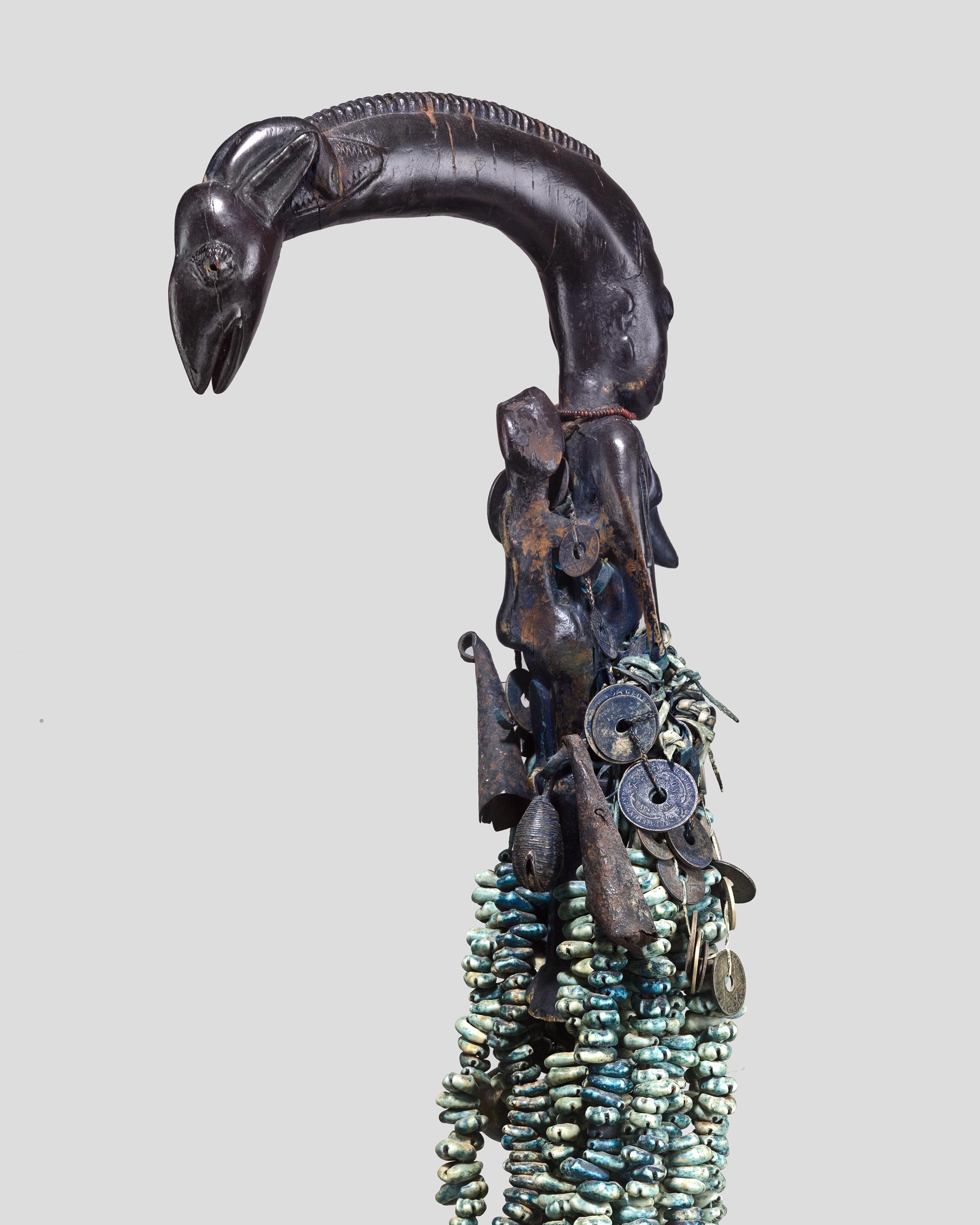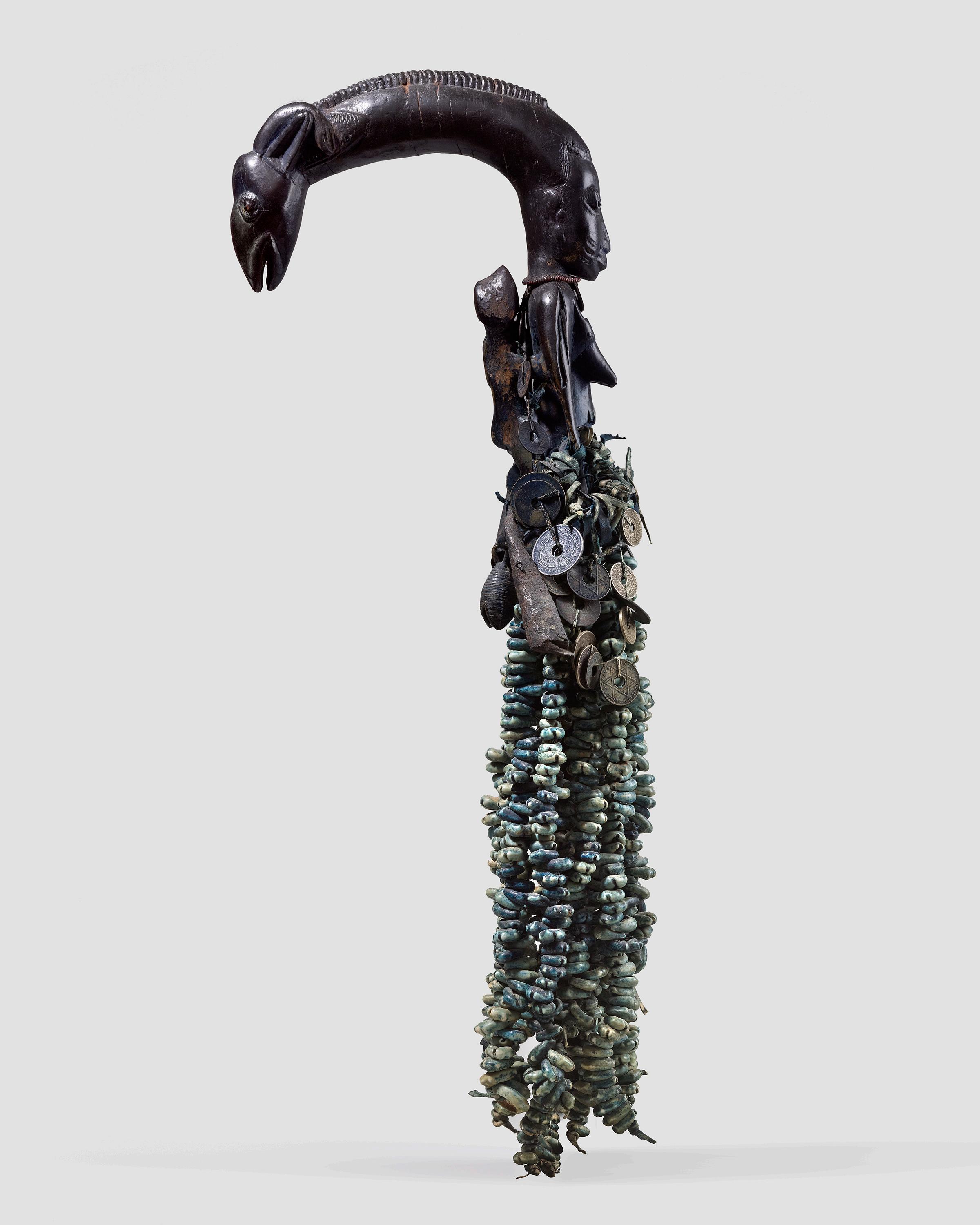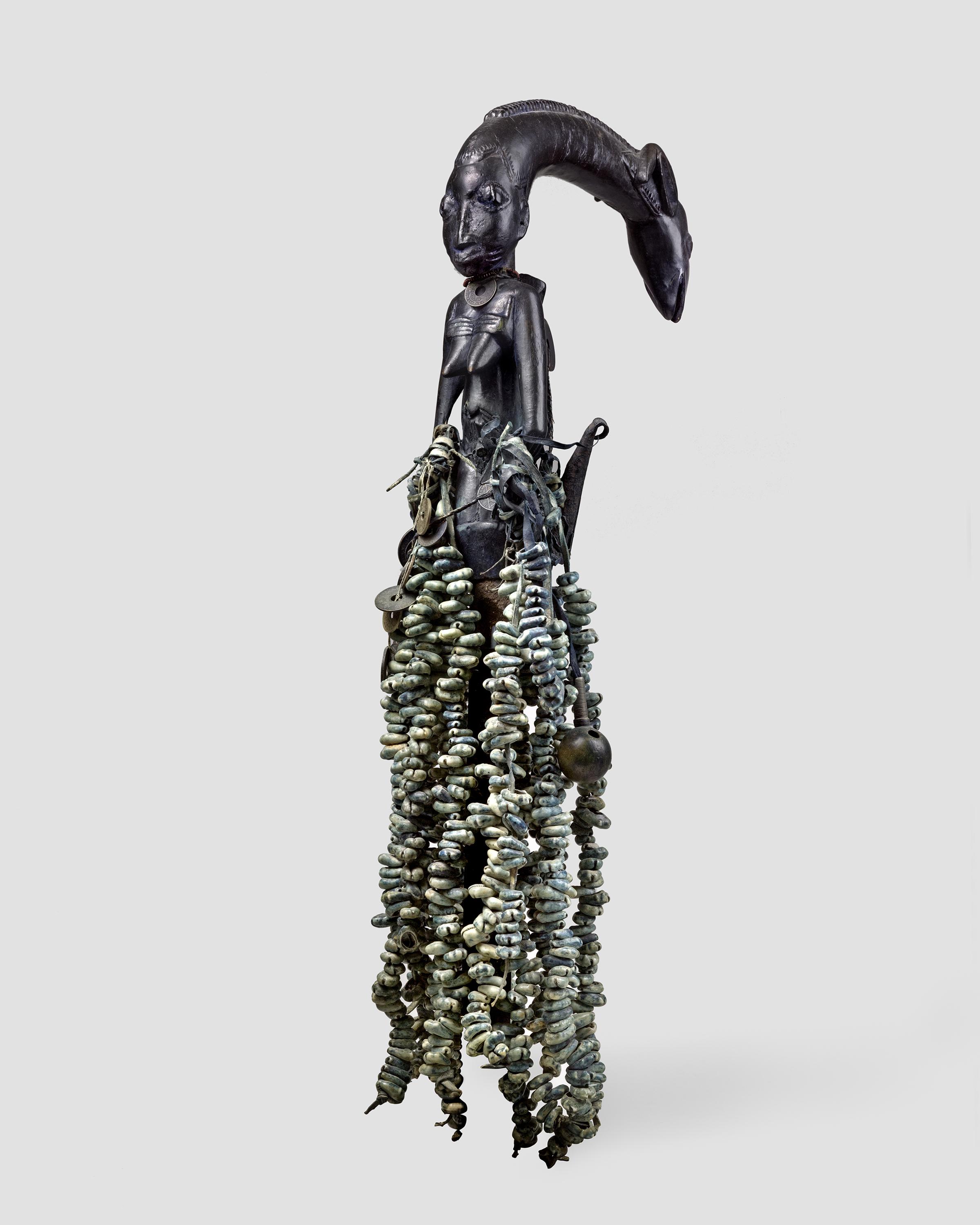 Wood, natural indigo pigment, metal alloy, cowrie (cyprea moneta), leather, twine H: 64cm