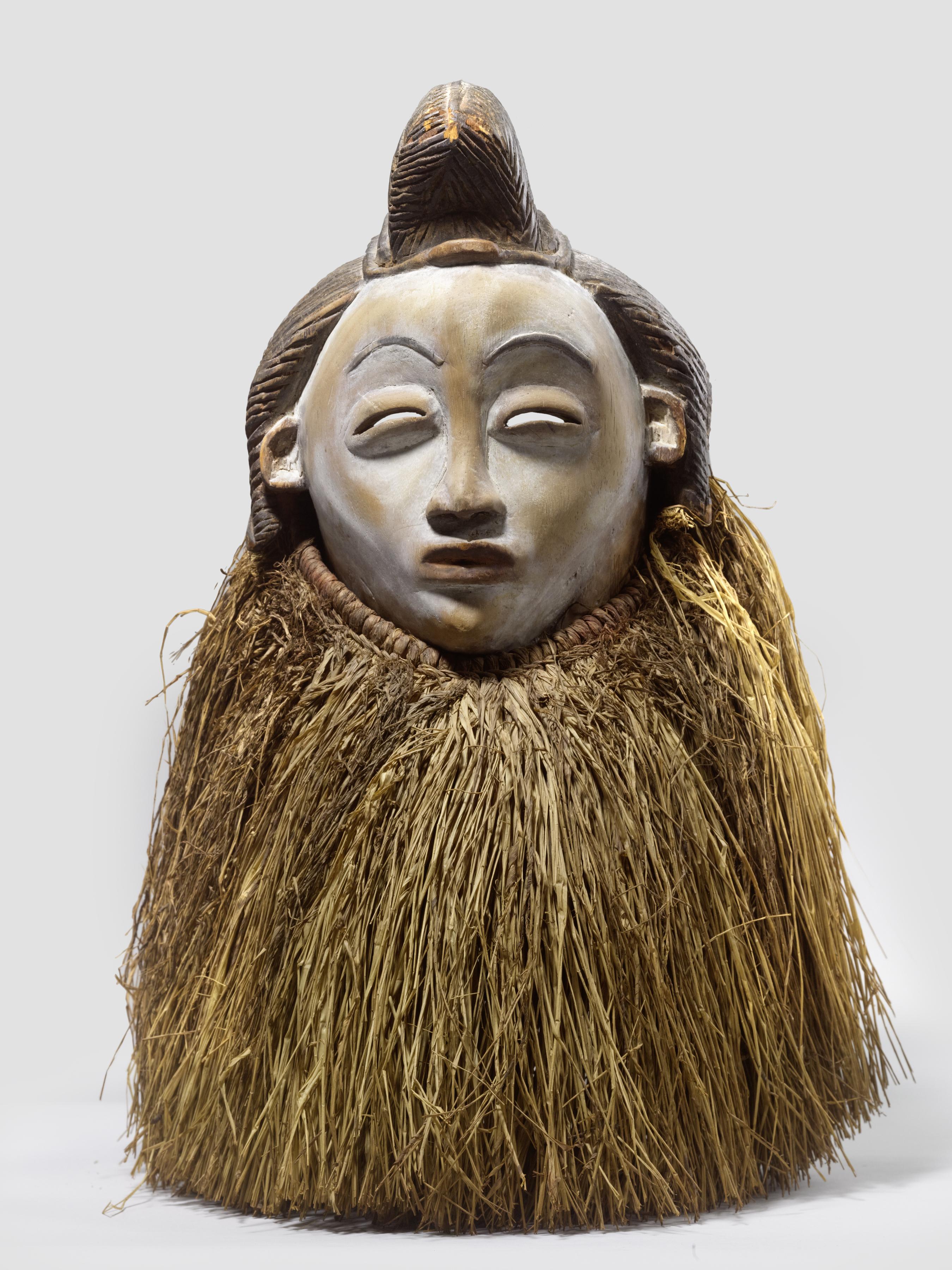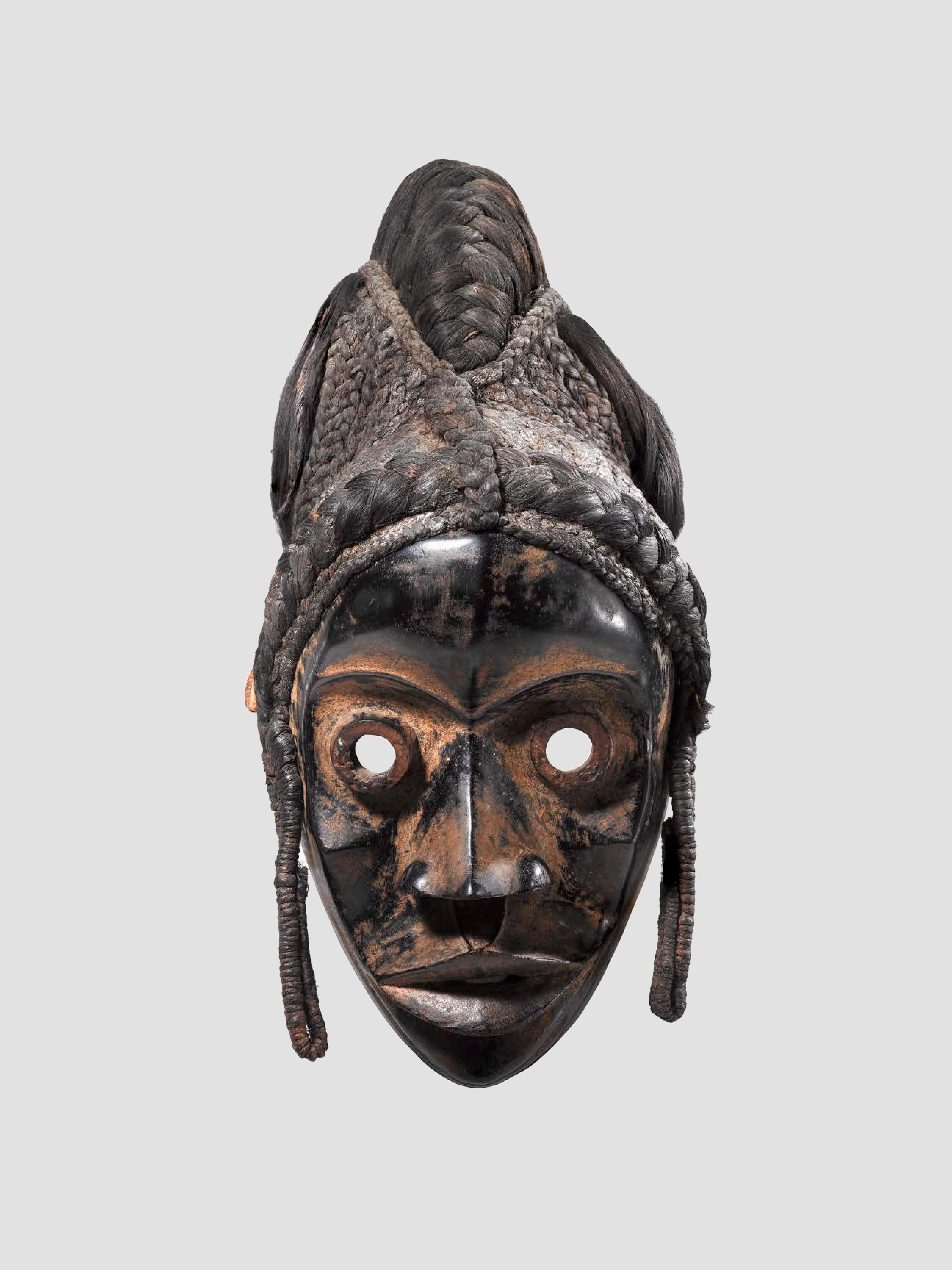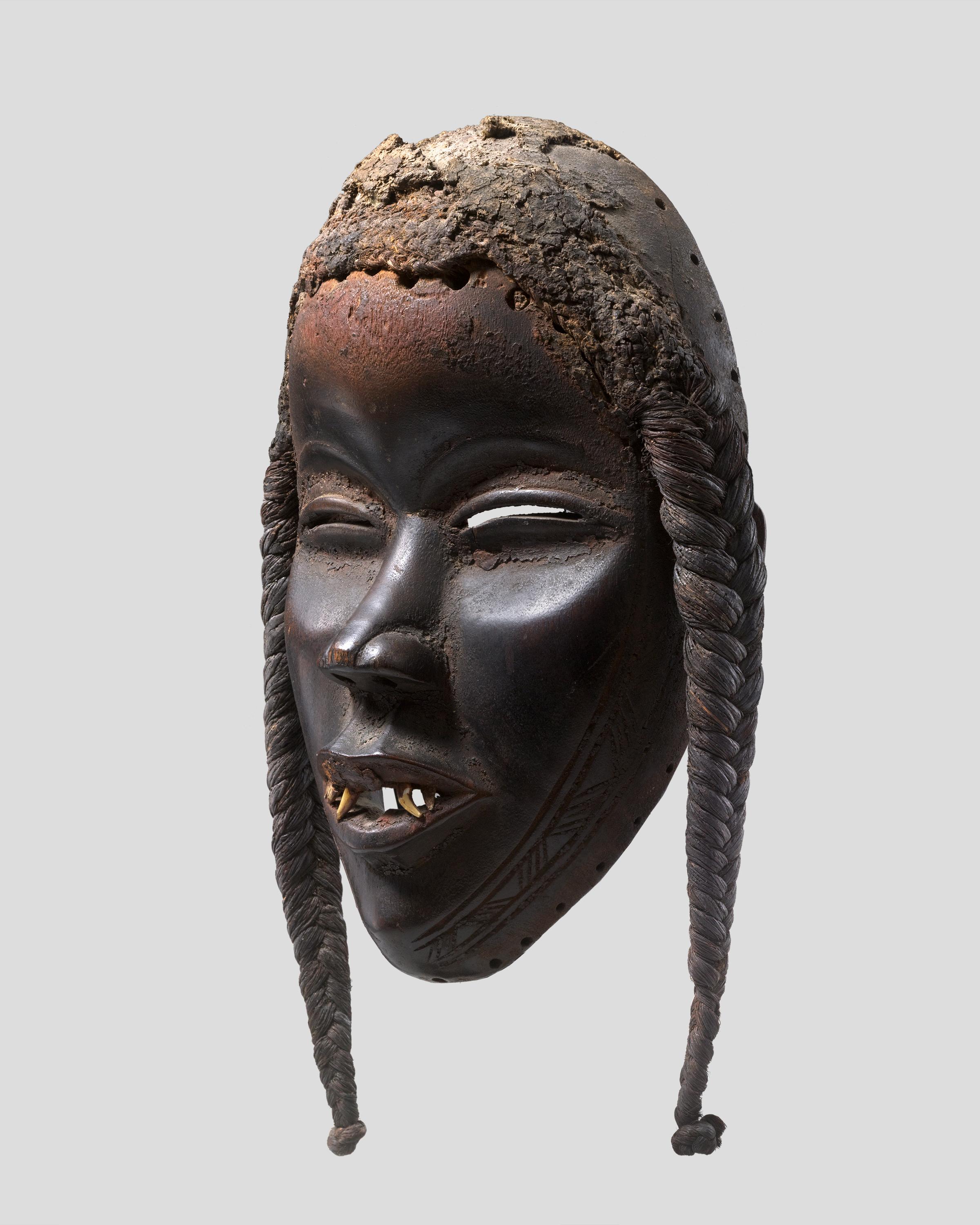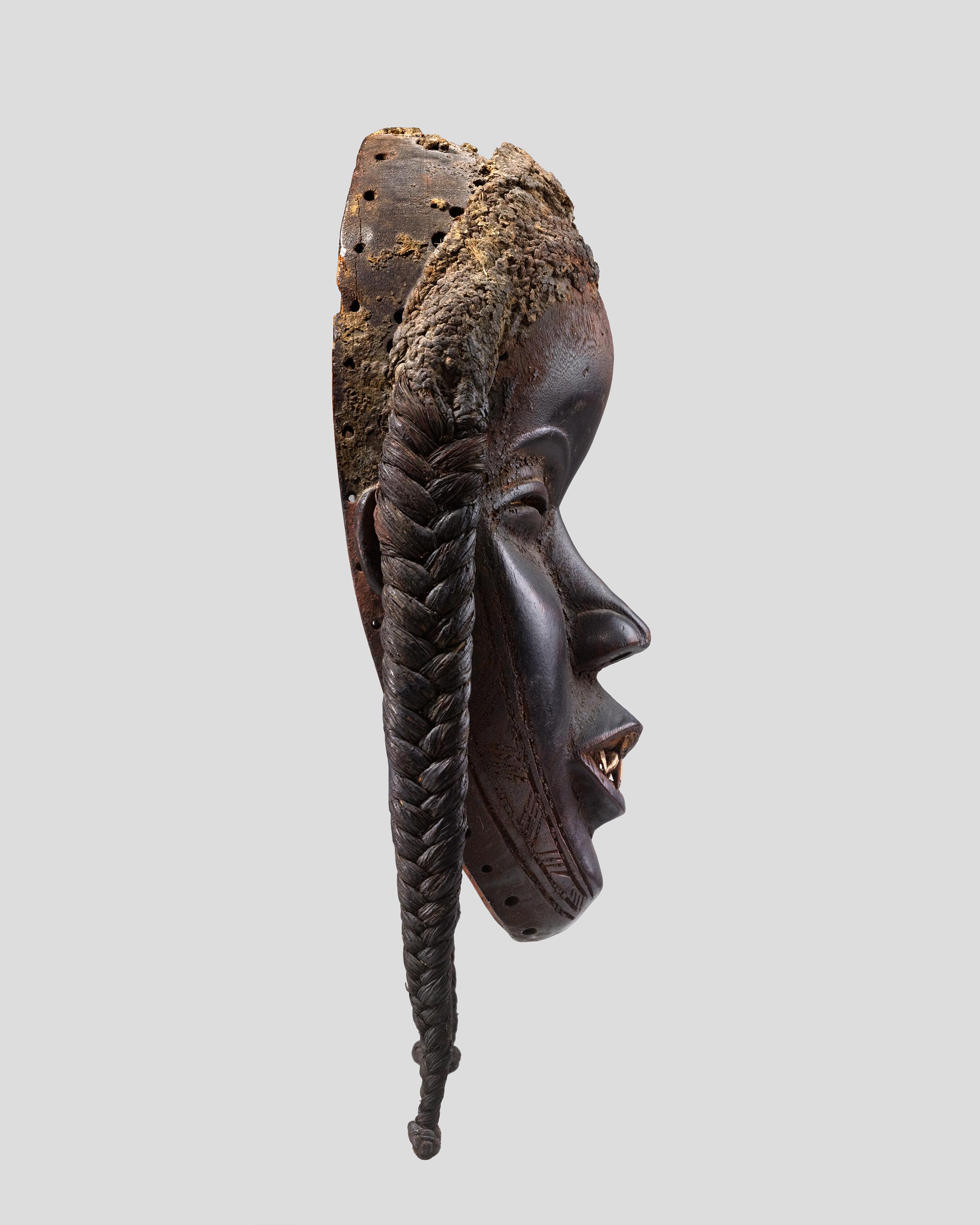 “…this is a zakpai/zakpei fire mask or a gunyege runner mask. But read the comment by Marie-Noël Verger-Fèvre about a similar mask in the Barbier-Mueller collection (AHDRC 0137400): "The Barbier-Mueller Museum, Geneva, possesses a very similar mask, which has also retained its original, extremely ancient coiffure - a very rare feature in western collections. (Barbier, 1993, t. II, p. 60, inv. No. 1003-14). Writing about this mask, Marie-Noël Verger-Fèvre points out that although the round, latticed eye sockets generally denote gunyege racing masks and zapkei fire masks, the intricacy of the fibre postiche may well point to a much higher ranking figure - the "mask of the king" or go ge. It sometimes appears, in Dan country, alongside the leaders of lineage groups. It is a large mask that leaves the sacred dwelling only to announce the death of the 'king', or for other such serious matters. [...] Some are adorned with very intricate fibre postiches that mimic those of ancient warriors" (in Barbier, ibid.). (Source: AHDRC 0065919).”