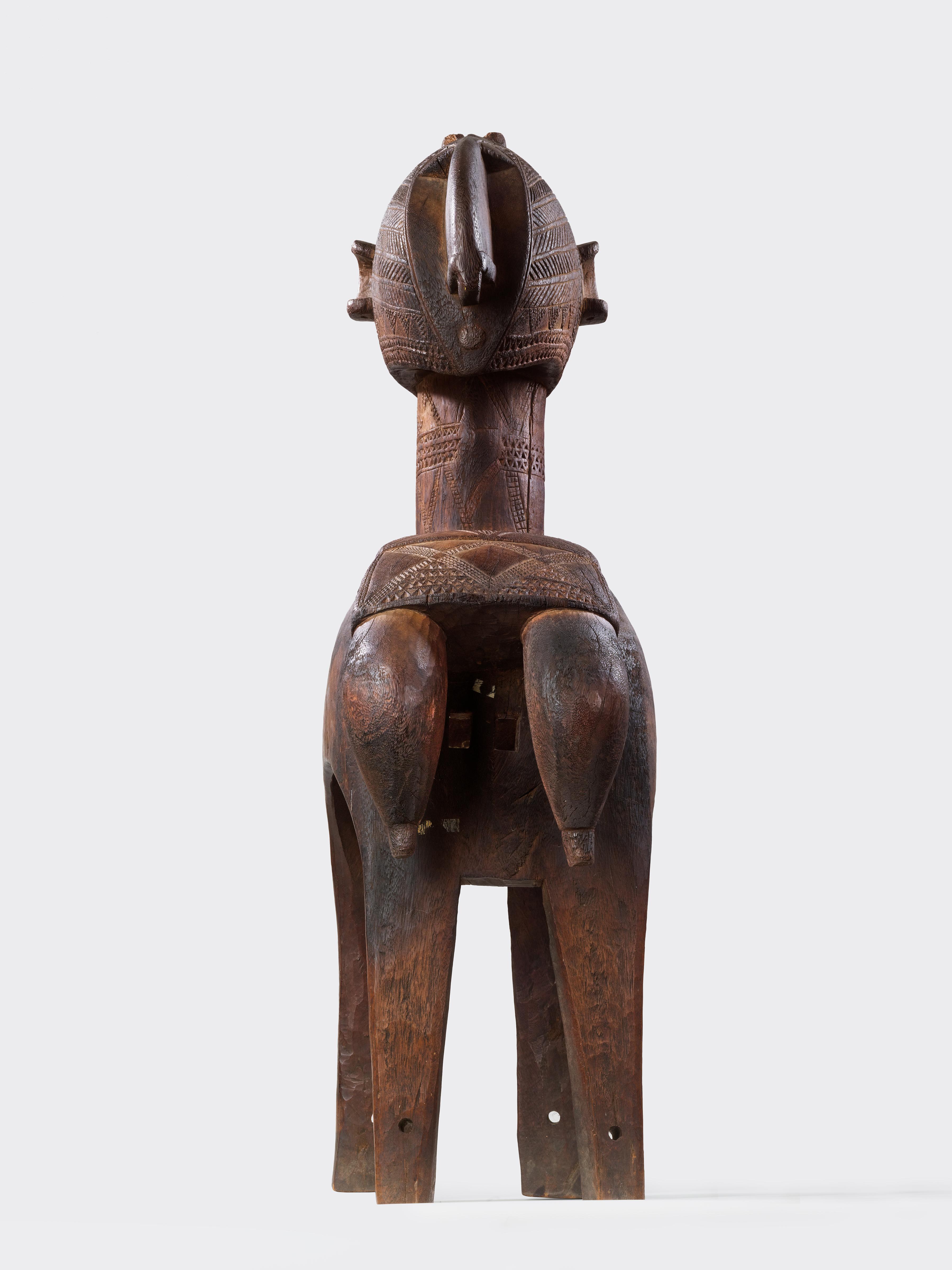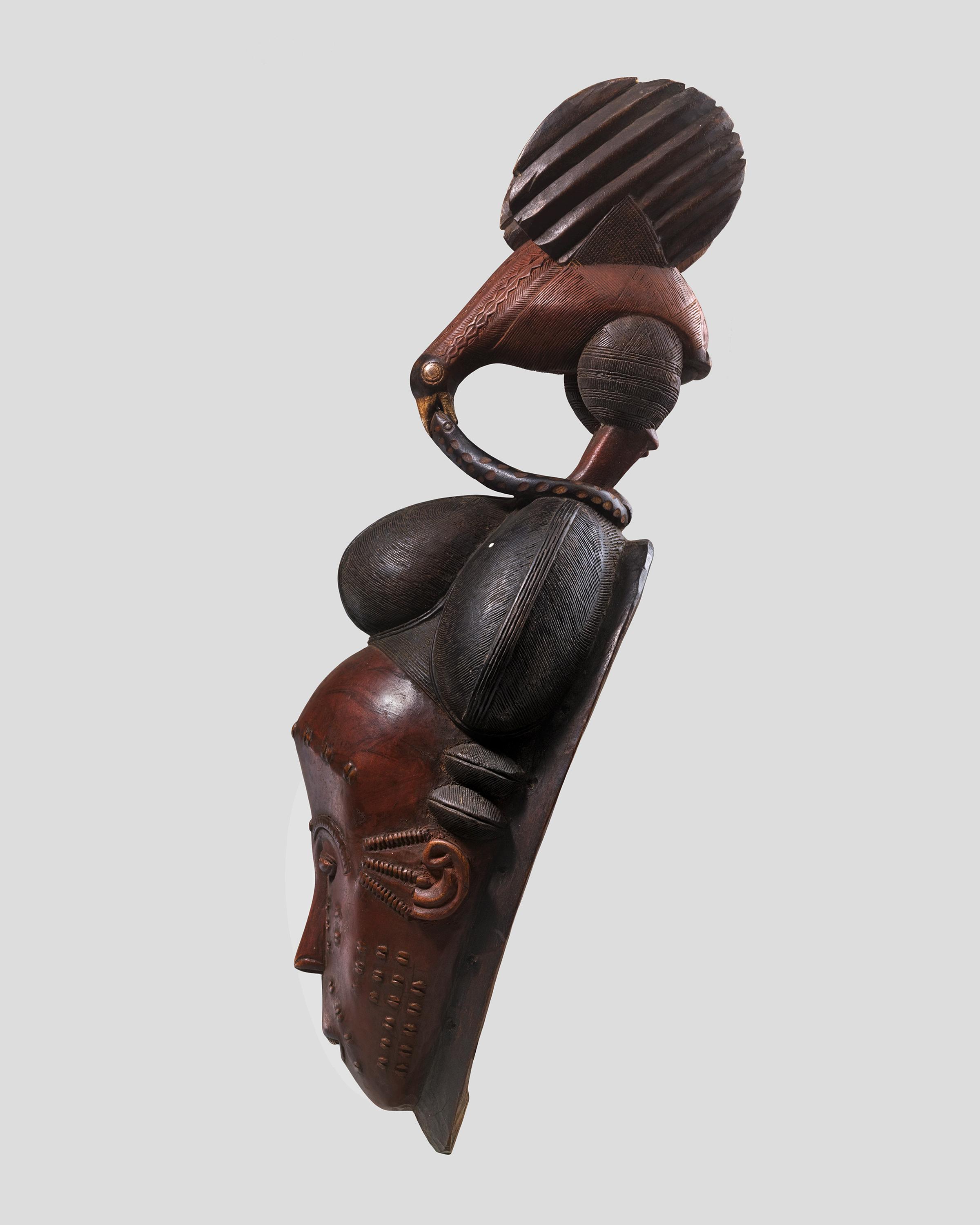As famous, emblematic, iconic as it is rare, the Nimba mask, thus named by foreigners, D'mba by the Baga Sitemu, and Yamban by the Pukur (Izart, 1935: 22), can be literally transliterated as the "good spirit". The narrow corpus summarized by Frédéric Lamp (Art of the Baga, 1996, p. 155-179) forms only fifteen copies, thus cementing the sculptural language, and serving as a testament to the strength of belief of the Baga people, their resilience and their ability to reinvent their art and society.