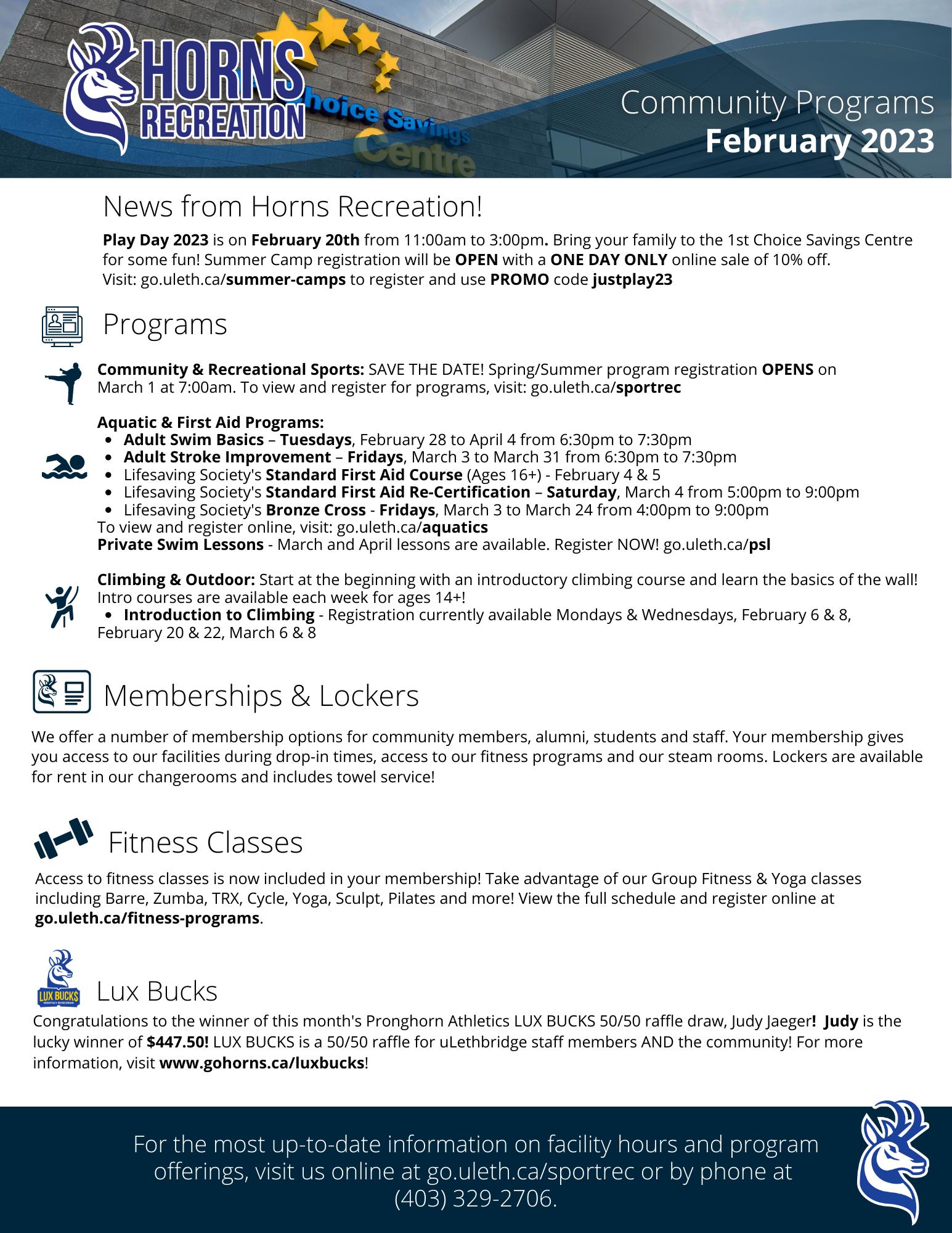 ? Looking for more Information? www.lethbridge.ca city of lethbridge @LethbridgeCity • Calendar of Events • Bus Routes & Schedules • • What’s New • Online Community Resource & Leisure Guide • www.helpseeker.org Access current & reliable information and refferal to services, agencies, organizations, programs & events in your area www.artslethbridge.org Your Source For Arts in Lethbridge info@artslethbridge.org City of Lethbridge 24 Hour Info Public Skating 403-320-4971 Winter Ice Safety 403-320-4974 Transit Information 403-320-3111 Assistance during Regular Hours Recreation & Culture 403-320-3020 Transit Office 403-320-3111 Lethbridge 311 311 other inquiries? leisure@lethbridge.ca Welcome to the February 2023 Recreation & Culture Guide Find your Gateway to fun!