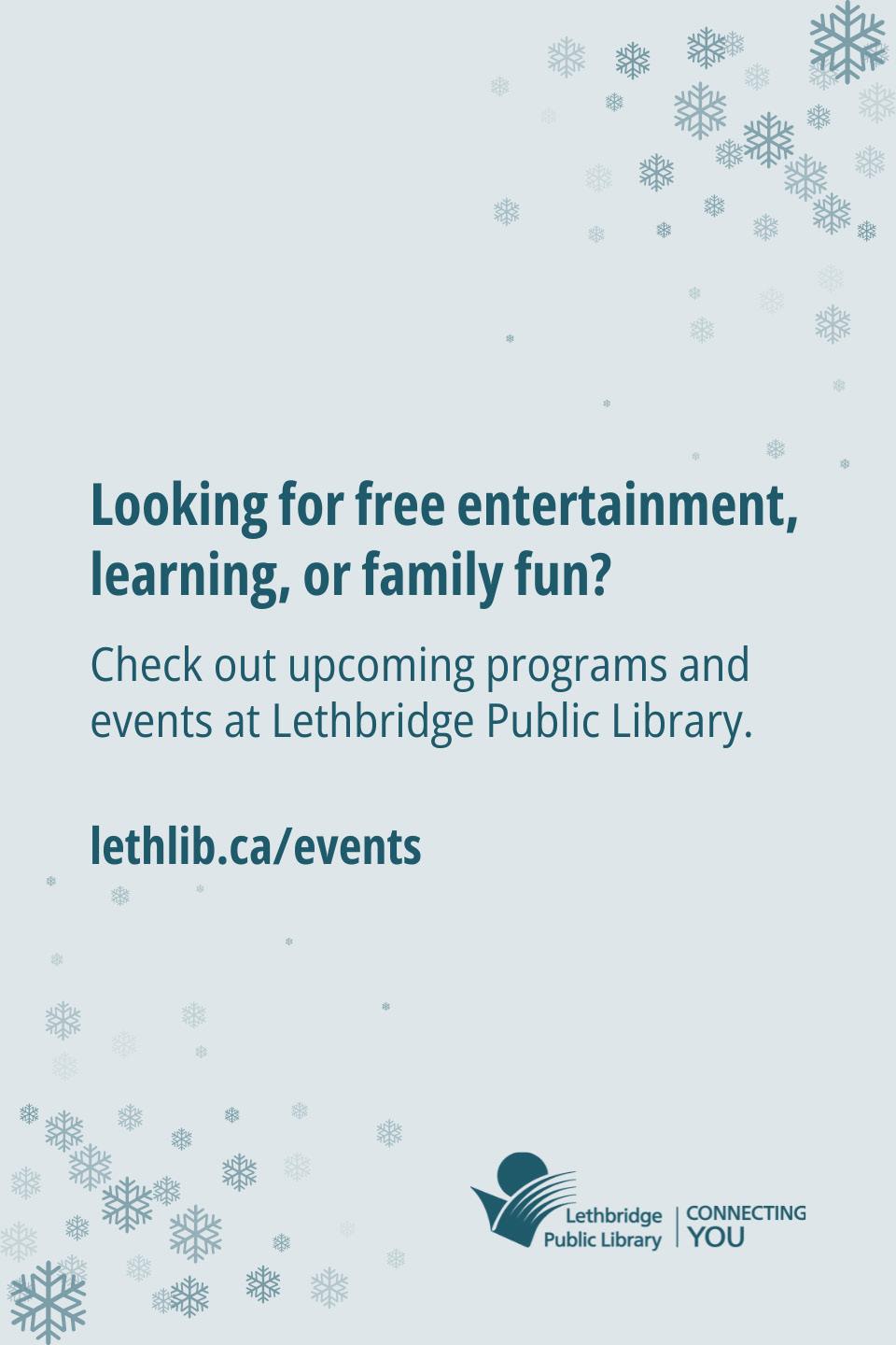 Join us for our January Speaker Series on Tuesday the 27 at 6:30pm, in Downtown Library. Free to attend, and all are we th This month we’ll be welcoming Sherri Gallant, retired Lethbridge journalist nature of media & journalism, how it affects community records, and th