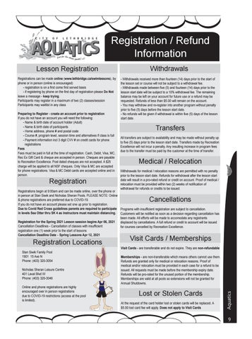 Registrations begin at 9:00am and can be made online, over the phone or in person at Stan Siwik and Nicholas Sheran Pools. PLEASE NOTE: Online & phone registrations are preferred due to COVID-19. If you do not have an account please set one up prior to registration. Due to Covid Red Cross guidelines parents are required to participate Programs with insufficient registration are subject to cancellation. in levels Sea Otter thru SK 4 as instructors must maintain distancing. Customers will be notified as soon as a decision regarding cancellation has been made. All efforts will be made to accomodate any registrants Registration for the Spring 2021 Lesson session begins Apr 06, 2021 displaced by cancellations. A full refund or credit to account will be issued Cancellation Deadlines - Cancellation of classes with insufficient for courses cancelled by Recreation Excellence. registration one (1) week prior to the start of lessons Cancellation Deadline Date - Spring Lessons Apr 12, 2021