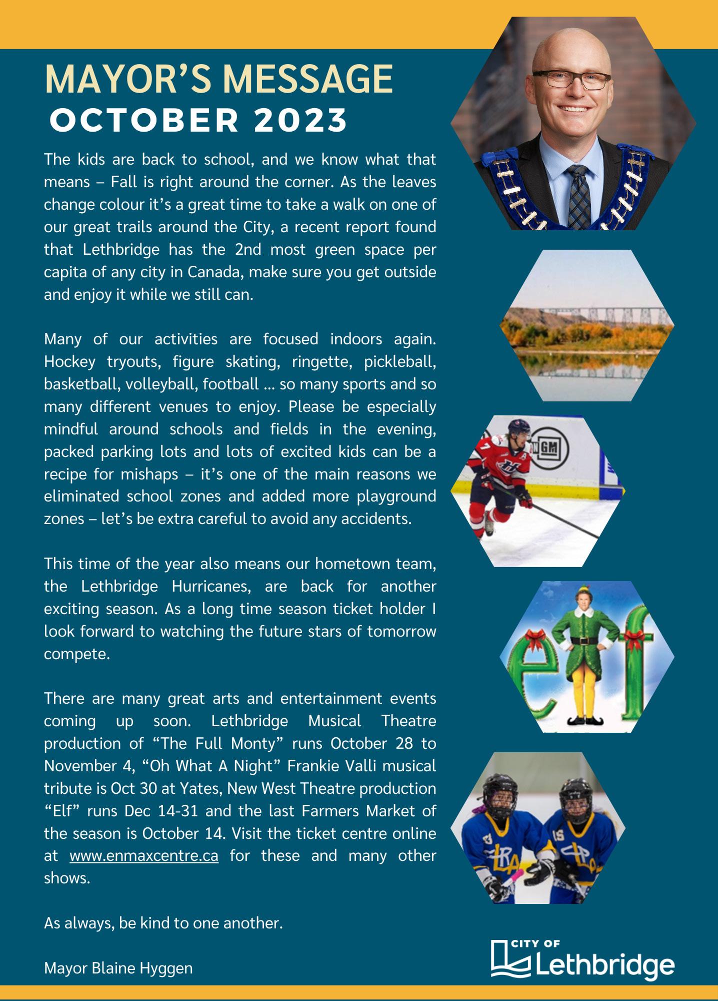 Local residents can be informed, give feedback and connect with the City of Lethbridge at the Community Conversation, October 23 at the ENMAX Centre. From 3-7 p.m. various City programs and services will be on display on the ENMAX concourse. Participants will have the opportunity to give feedback on future City planning through interactive activities and surveys. The event is free to attend and will include something for people of all ages. Free public skating will be available and for the littlest residents the opportunity to check out some of big equipment from our public operations teams.