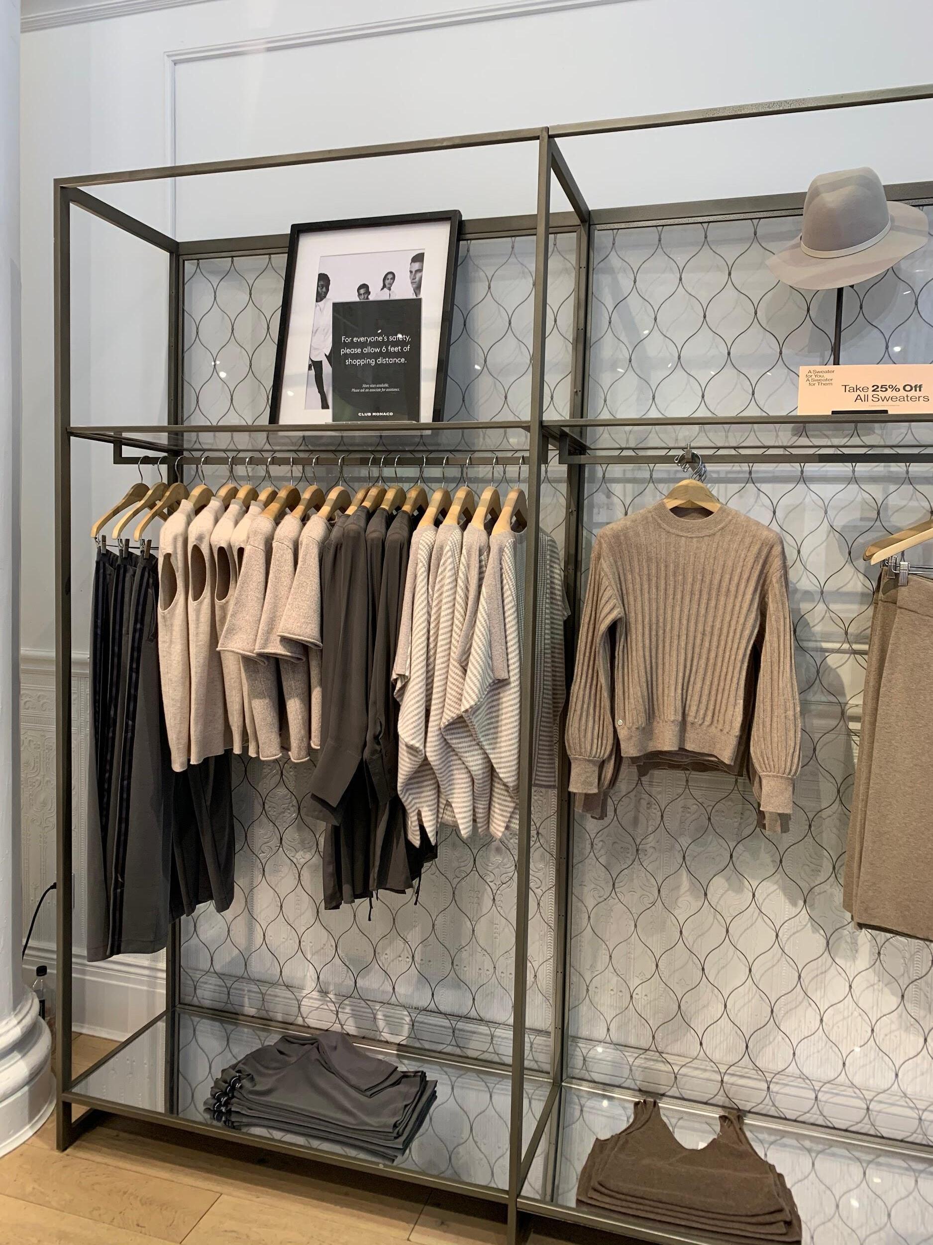 Club Monaco is a store founded around the idea of “better basics”, which is also very apparent through their selection of garments. The whole store follows a color palette that is very similar to the one chosen for Aritzia; very neutral and for a more sophisticated customer.
