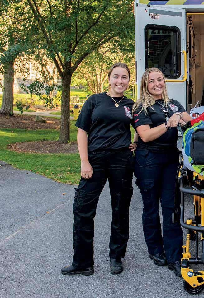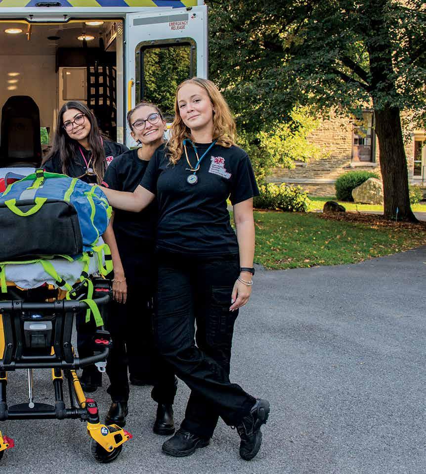 Student volunteers from Madison County EMS at the activities fair on campus. (L to R) Cece Peter ’27, Michelle Ovchinsky ’26, Arianna Stolowitz ’26, Arianne Motakef ’27, and Clara Vickery ’26 are five of the 32 Colgate student volunteers on the crew. November marked the one-year anniversary of the switch from the Southern Madison Ambulance Corps to Madison County EMS.