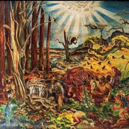 The winter 2024 edition of the Colgate Magazine highlighted a recent exhibition of the art of Lee Brown Coye at the Picker Art Gallery (“The Ghastly and Grand World of Lee Brown Coye,” p. 10). For those interested in seeing more of the artist’s work, a large, multipanel mural is always on display in the village of Hamilton. The paintings depict the founding of Hamilton with emphasis on the Civil War years — its role in the abolition movement and its location as a station on the Underground Railroad. The mural was commissioned by Doane’s Steak House, which later became Hickey’s Tavern. When the tavern was closed and sold, the mural was restored and loaned to the village. It has been on display at the Hamilton Post Office since 1996. Will Keller ’84