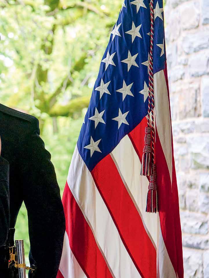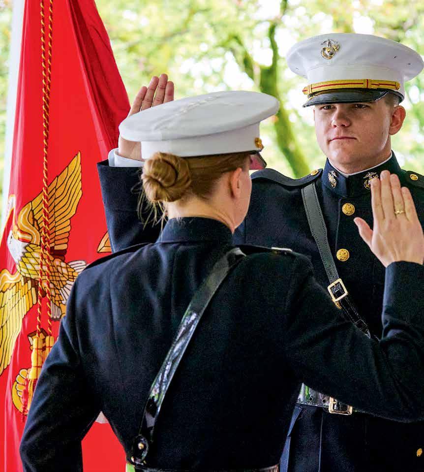 The Marine commissioning ceremony for Matthew H. “Hobie” Jamison ’25, on the Merrill House porch, May 17. Jamison is from Vail, Colo., and he majored in peace and conflict studies as well as English. He’s now a second lieutenant in the U.S. Marine Corps, where he will become a pilot after flight school. “Colgate allowed me to work hard, prove myself, and set the conditions to overcome challenges of life and succeed despite them,” he says.
