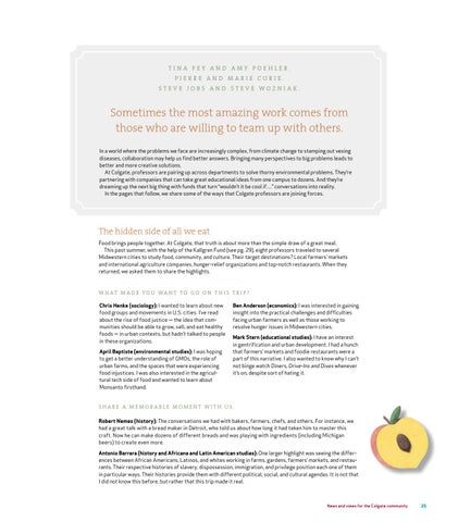 The hidden side of all we eat Food brings people together. At Colgate, that truth is about more than the simple draw of a great meal. This past summer, with the help of the Kallgren Fund (see pg. 29), eight professors traveled to several Midwestern cities to study food, community, and culture. Their target destinations? Local farmers’ markets and international agriculture companies, hunger-relief organizations and top-notch restaurants. When they returned, we asked them to share the highlights.