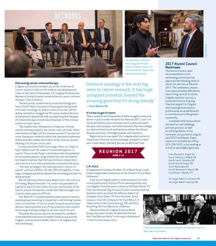 Discussing cancer immunotherapy Colgate community members are at the forefront of cancer research, both on the medical and development sides of the field. On November 14, Colgate Professional Networks hosted a panel conversation on cancer immunotherapy in San Francisco. The discussion, moderated by associate biology professor Geoff Holm, focused on the progress being made in immuno-oncology, as well as issues of access, affordability, and ethics. Gregg Fine ’94, senior medical director at Genentech, opened the talk by explaining that the goal of immunotherapy is to harness the power of the immune system to treat cancer. “Our bodies have checkpoints to keep our immune system working properly, but cancer cells can coopt these mechanisms to fight off the immune system,” Fine said. Immune checkpoint inhibitors block the checkpoint pathways and essentially release the brakes of the immune system, allowing it to attack cancer cells. In and around the field of oncology, there is a “hope vs. hype” debate over the value of immunotherapeutic research. Those on the “hope” side believe that the potential of immunotherapeutic drugs makes the cost worthwhile, but skeptics believe that the hype distracts researchers and investors from other potentially successful therapies. “Immuno-oncology is the next big wave in cancer research,” said Carin Rollins ’94, the CEO of Hinge Bio. “It has huge, untapped potential, beyond the amazing good that it’s doing already.” One of the issues that causes skepticism is the scarcity of funding. Wayne Feinstein ’74, senior vice president of Capital Group’s Private Client Services and founder of the Gastric Cancer Foundation, noted that federal budget constraints make research difficult. Tom White P’17 emphasized the importance of venture capital groups investing in researchers and forming foundations to fund them. “If not for small, focused research foundations, there would be a lot of top scientists who couldn’t find enough funding to begin to do their work,” he said. The panel discussion was live streamed for students in the National Institutes of Health Study Group and the Colgate community worldwide. Watch it at colgate.edu/ immunotherapy.