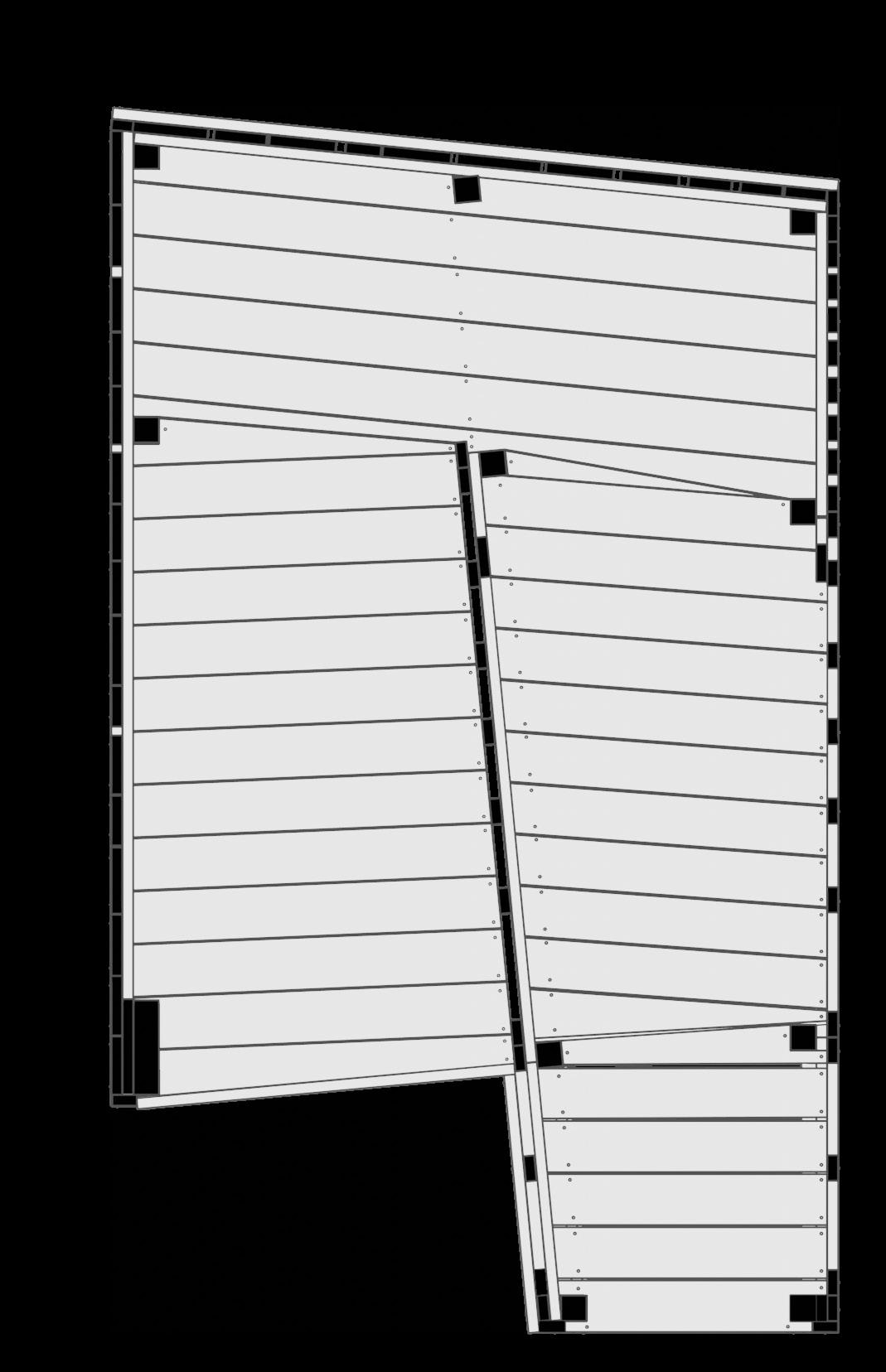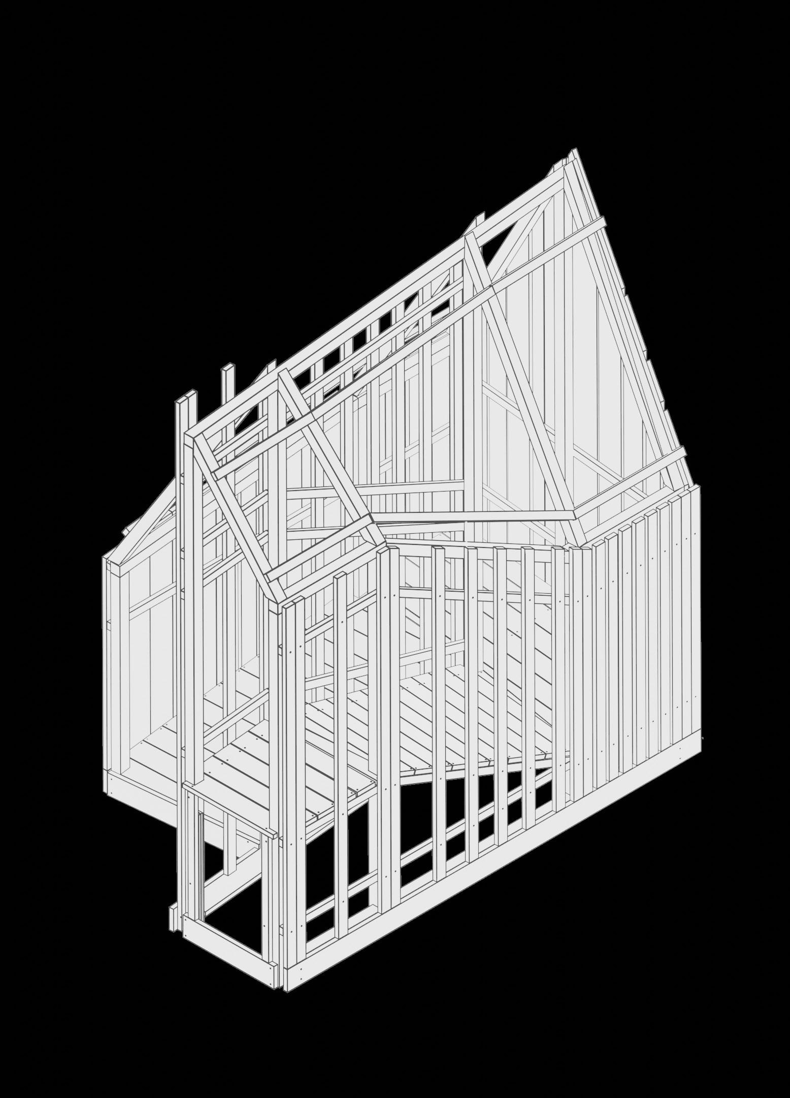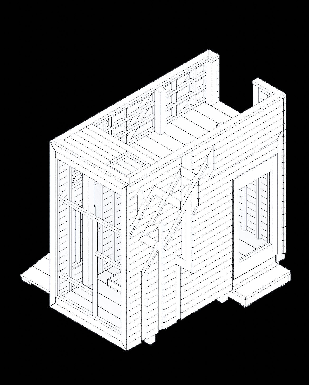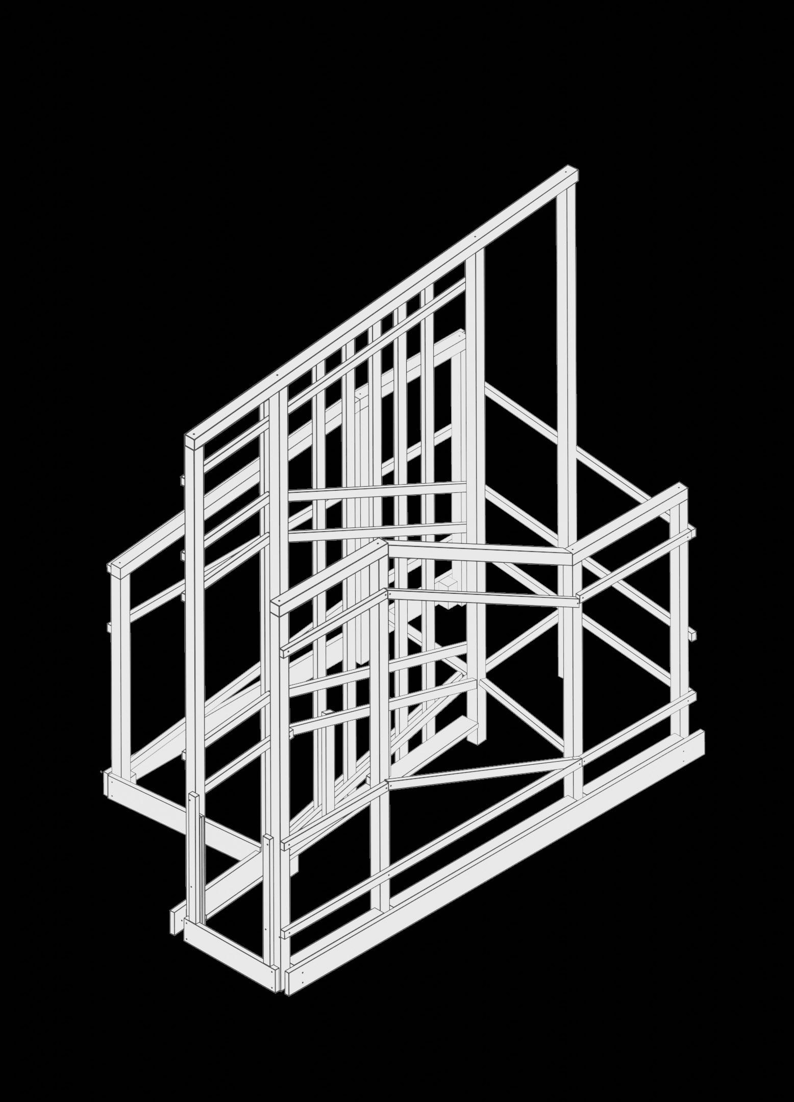 The observatory draws upon the image of cabin architecture, but explores more complex geometry achieved through straight lines and rationalized by responding to a series of ramps. The observer experiences a gradient of increasing transparency in the observatory’s skin while progressing up the ramps.