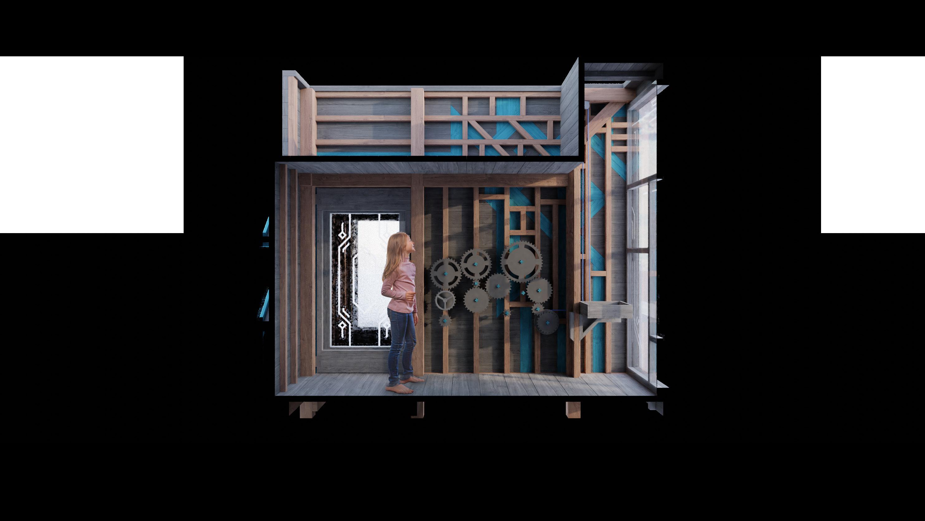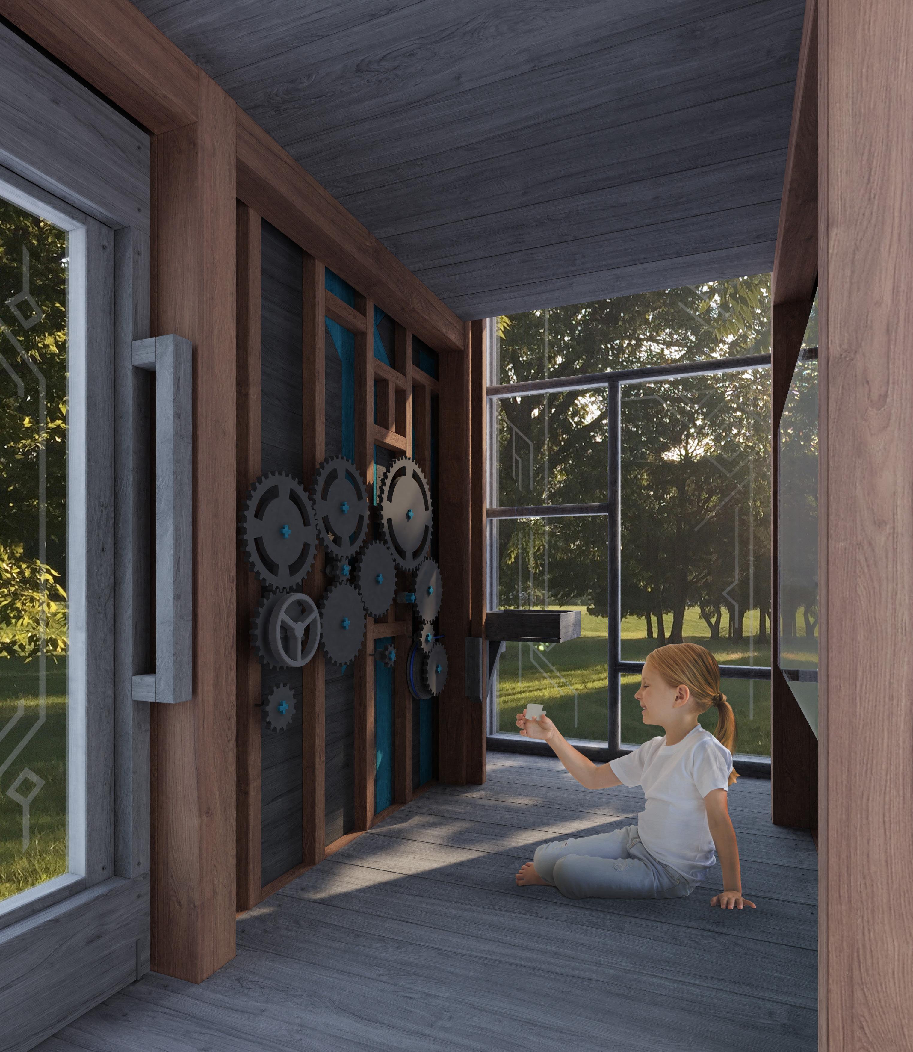 A balance between convention and interest drives the design as it aims to balance pure orthogonal geometry with interrupting points of aesthetic, and even interactive interest. A puzzle on the interior, in which gears must be placed in the correct spot, operates a pulley system once complete, allowing small objects to be lifted to the roof in a box. The roof is accessible via climbing elements matching the meandering pattern running through the entire structure.