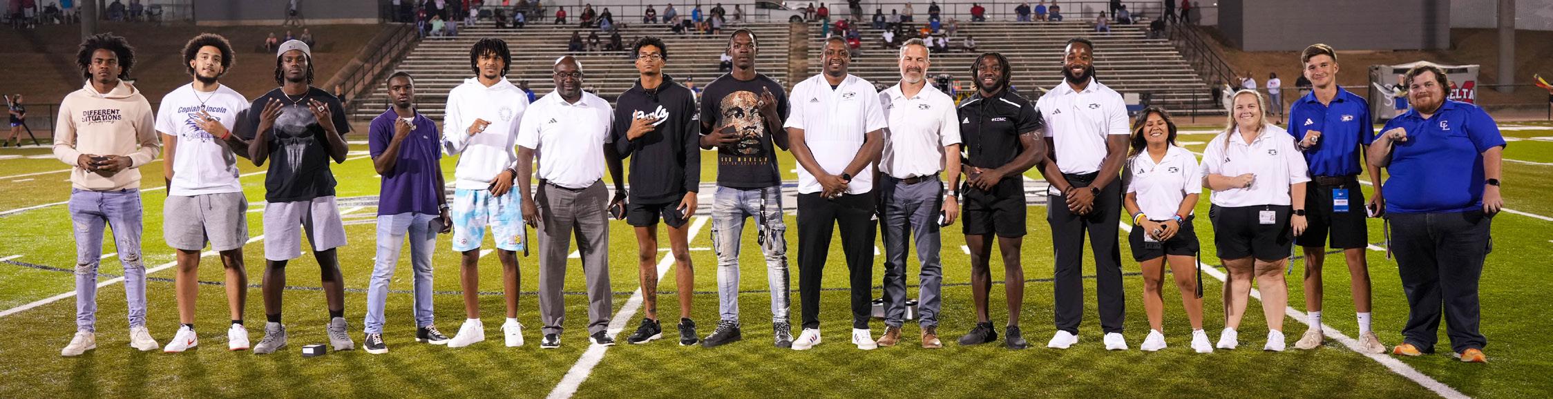 After winning the 2023 MACCC State Championship in men’s basketball, the team, coaches, and other athletic staff were recognized on the field during halftime at a football game this fall.