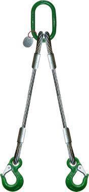 In diesem Fall werden die Stränge des Anschlagmittels durch eine Last geführt oder unter einer Last hindurchgeführt und das Anschlagteil im Strang eingehängt. Diese Anschlagart kann benutzt werden, wenn keine geeigneten An schlagpunkte vorhanden sind und bietet den wei teren Vorteil, dass das Anschlagmittel die Last zusammenschnürt. Bei Anwendung des Schnürganges ist die Tragfähigkeit des Anschlagmittels auf 80 % (Belastungsfaktor 0,8) der gekenn zeichneten Tragfähigkeit begrenzt.