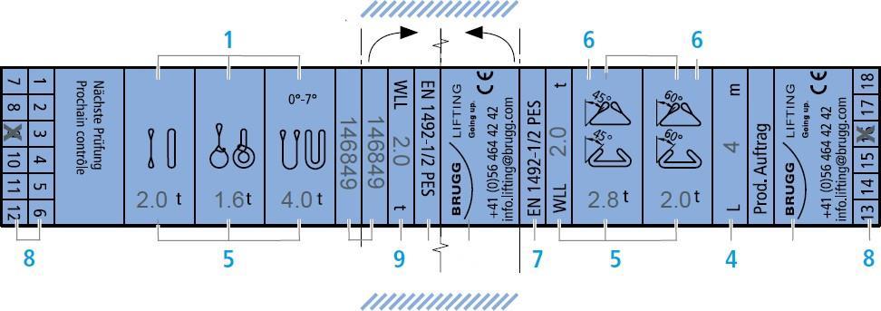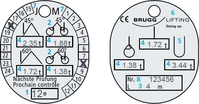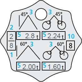 16.12 Kennzeichnung von Anschlagketten 1. Kettennenngröße 2. Anzahl Stränge 3. Neigungswinkelbereich der Stränge 4. Nutzlänge (Auflage Auflage) 5. WLL in t (Working Load Limit) 6. Offene Anschlagarten (im Bau nicht empfohlen) 7. Hersteller 8. Datum der nächsten Prüfung (Jahr/Monat) 9. Herstellernummer 10. Güteklasse 8 = Anzahl der Ecken am Kettenanhänger