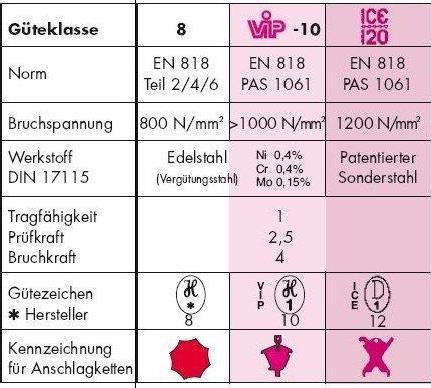 Auszug Belastungstabelle für Rundstahlketten der Güteklasse 8