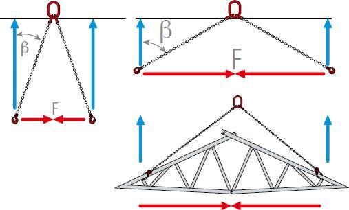Wird die Last mit einem mehrsträngigen Anschlagmittel unter einem An schlagwinkel angeschlagen, so entstehen zu den senkrechten Hubkräften dem Anschlagwinkel entsprechende horizontale Druckkräfte. Bei nicht ge nügend stabilen Lasten z.B. Fachwerkbinder, Fertigelemente oder bei ex trem flachen Anschlagwinkeln können bei den Anschlagpunkten Druckstel len entstehen oder die Last knickt unter der horizontalen Druckkraft ein.