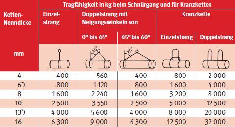 Nach Zuhilfenahme der Belastungstabelle ist festzustellen, dass das Ket tengehänge gerade noch ausreicht.