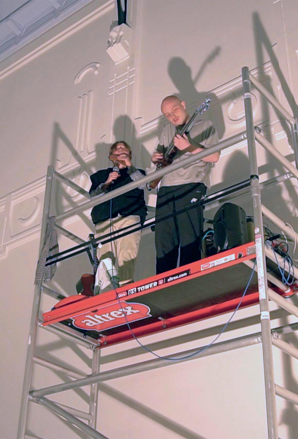 In de performance werd het Galileo Galileilied gezongen en werden verschillende muziekinstrumenten van een steiger gegooid.