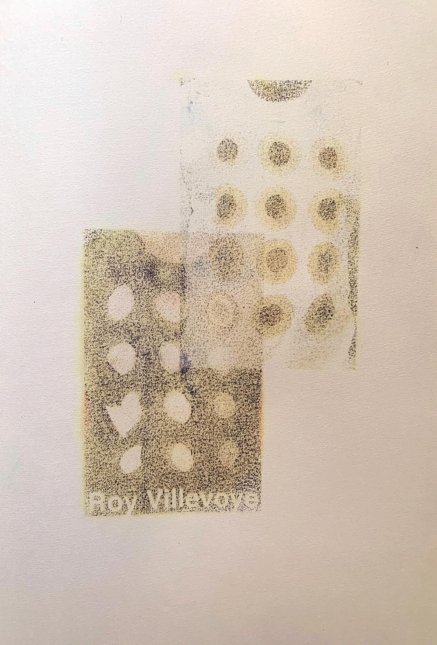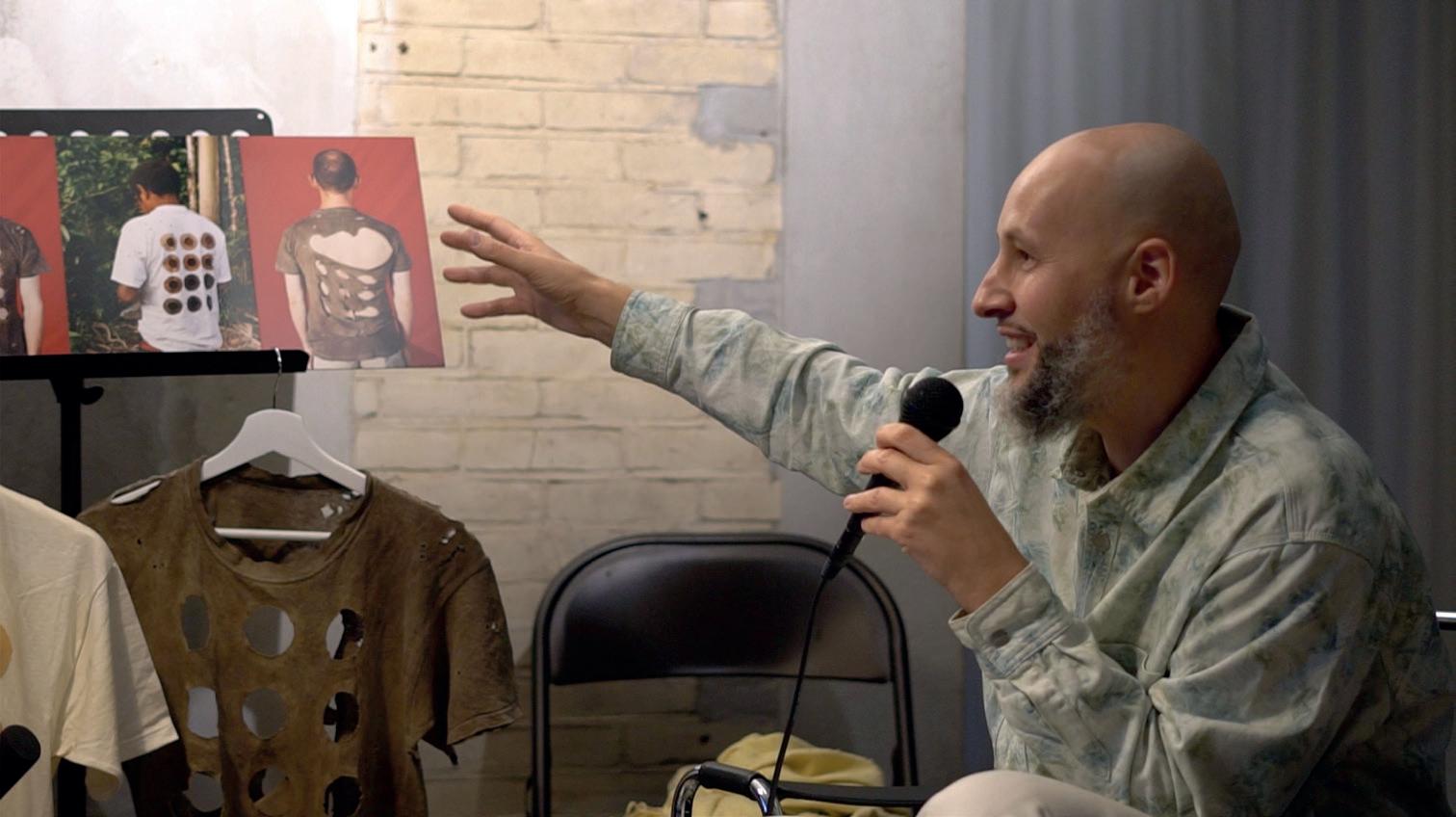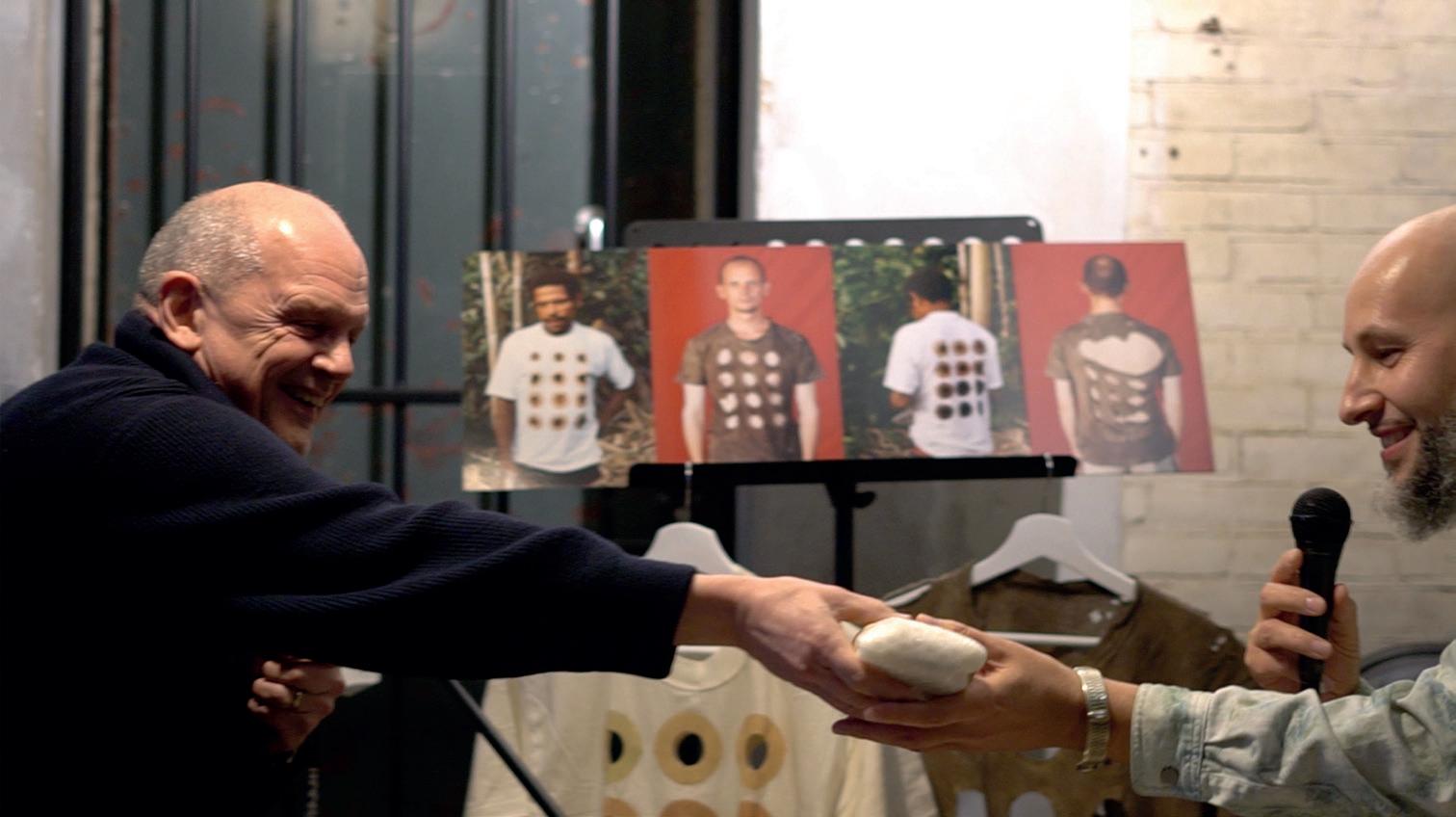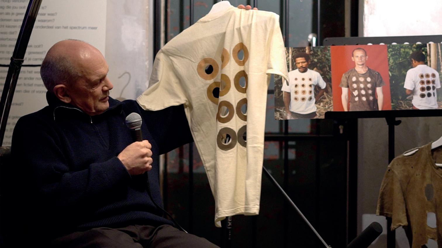Roy naar zijn meegebrachte werk. Een tweetal T-shirts waarin systematisch een aantal ronde gaten zijn aangebracht. Rond de gaten zijn cirkels in verschillende huid tinten te zien. Roy vertelde hoe hij op deze manier afstapte van het schilderij en met dit T-shirt een directe verbinding met de echte huid kon maken. Hij kon als het ware de echte huidskleur matchen met één van de tinten op zijn T-shirt. Min of meer uit het niets -zo vertelde hij- voelde hij de drang om een reis te maken naar Papua Nieuw Guinea. Hij ging op reis met een fototoestel en een aantal van zijn “gaten” T-shirts. Hij voelde zich daar ongemakkelijk bij omdat hij zich realiseerde dat hij niet zijn cultuur daar naartoe wilde brengen en zeker niet de cultuur daar wilde gebruiken voor zijn eigen kunst. Hij beloofde zichzelf dat hij het meegenomen fototoestel niet daarvoor zou gebruiken. Na een tocht van een week kwam hij aan in een dorp met