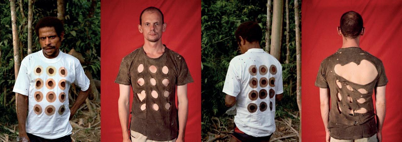 oorspronkelijke bewoners die nog ver van onze wereld stonden. Hij deelde daar de vijf T-shirts uit die hij meegenomen had. Hij werd overrompeld door wat hij zag toen deze mensen zijn T-shirts droegen. “Ik heb toen toch foto’s gemaakt” zei hij. Eén van die foto’s van een man die zijn