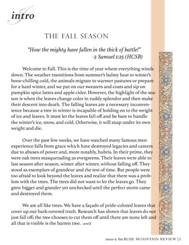 intro The Fall Season “How the mighty have fallen in the thick of battle!” -2 Samuel 1:25 (HCSB) Welcome to Fall. This is the time of year where everything winds down. The weather transitions from summer’s balmy heat to winter’s bone-chilling cold, the animals migrate to warmer pastures or prepare for a hard winter, and we put on our sweaters and coats and sip on pumpkin spice lattes and apple cider. However, the highlight of the season is when the leaves change color in ruddy splendor and then make their descent into death. The falling leaves are a necessary inconvenience because a tree in winter is incapable of holding on to the weight of ice and leaves. It must let the leaves fall off and be bare to handle the winter’s ice, snow, and cold. Otherwise, it will snap under its own weight and die. Over the past few weeks, we have watched many famous men experience falls from grace which have destroyed legacies and careers due to abuses of power and, more notably, hubris. In their prime, they were oak trees masquerading as evergreens. Their leaves were able to last season after season, winter after winter, without falling off. They stood as exemplars of grandeur and the test of time. But people were too afraid to look beyond the leaves and realize that there was a problem with the trees. The trees did not want to let the leaves go. They grew bigger and grander yet unchecked until the perfect storm came and destroyed them. We are all like trees. We have a façade of pride-colored leaves that cover up our bark-covered truth. Research has shown that leaves do not just fall off; the tree chooses to cut them off until there are none left and all that is visible is the barren tree. cont’d I ssue