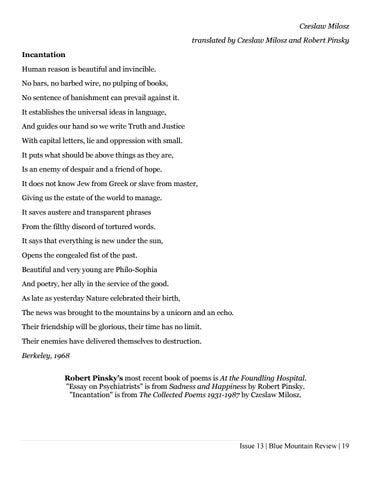 Czeslaw Milosz translated by Czeslaw Milosz and Robert Pinsky Incantation Human reason is beautiful and invincible. No bars, no barbed wire, no pulping of books, No sentence of banishment can prevail against it. It establishes the universal ideas in language, And guides our hand so we write Truth and Justice With capital letters, lie and oppression with small. It puts what should be above things as they are, Is an enemy of despair and a friend of hope. It does not know Jew from Greek or slave from master, Giving us the estate of the world to manage. It saves austere and transparent phrases From the filthy discord of tortured words. It says that everything is new under the sun, Opens the congealed fist of the past. Beautiful and very young are Philo-Sophia And poetry, her ally in the service of the good. As late as yesterday Nature celebrated their birth, The news was brought to the mountains by a unicorn and an echo. Their friendship will be glorious, their time has no limit. Their enemies have delivered themselves to destruction. Berkeley, 1968 Robert Pinsky’s most recent book of poems is At the Foundling Hospital. "Essay on Psychiatrists" is from Sadness and Happiness by Robert Pinsky. "Incantation" is from The Collected Poems 1931-1987 by Czeslaw Milosz.