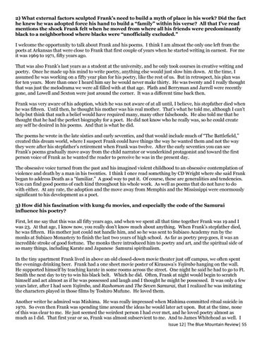 2) What external factors sculpted Frank’s need to build a myth of place in his work? Did the fact he knew he was adopted force his hand to build a “family” within his verse? All that I’ve read mentions the shock Frank felt when he moved from where all his friends were predominantly black to a neighborhood where blacks were “unofficially excluded.” I welcome the opportunity to talk about Frank and his poems. I think I am almost the only one left from the poets at Arkansas that were close to Frank that first couple of years when he started writing in earnest. For me it was 1969 to 1971, fifty years ago. That was also Frank’s last years as a student at the university, and he only took courses in creative writing and poetry. Once he made up his mind to write poetry, anything else would just slow him down. At the time, I assumed he was working on a fifty year plan for his poetry, like the rest of us. But in retrospect, his plan was for ten years. More than once I heard him say he would never make thirty. He was twenty and I really thought that was just the melodrama we were all filled with at that age. Plath and Berryman and Jarrell were recently gone, and Lowell and Sexton were just around the corner. It was a different time back then. Frank was very aware of his adoption, which he was not aware of at all until, I believe, his stepfather died when he was fifteen. Until then, he thought his mother was his real mother. That’s what he told me, although I can’t help but think that such a belief would have required many, many other falsehoods. He also told me that he thought that he had the perfect biography for a poet. He did not know who he really was, so he could create any self he desired in his poems. And that is what he did. The poems he wrote in the late sixties and early seventies, and that would include much of “The Battlefield,” created this dream world, where I suspect Frank could have things the way he wanted them and not the way they were after his stepfather’s retirement when Frank was twelve. After the early seventies you can see Frank’s poems gradually move away from the child narrator or wunderkind protagonist and toward the first person voice of Frank as he wanted the reader to perceive he was in the present day. The obsessive voice turned from the past and his imagined violent childhood to an obsessive contemplation of violence and death by a man in his twenties. I think I once read something by CD Wright where she said Frank began to address Death as a “familiar.” A good way to put it. Of course, these are generalities and tendencies. You can find good poems of each kind throughout his whole work. As well as poems that do not have to do with either. At any rate, the adoption and the move away from Memphis and the Mississippi were enormously significant to his development as a poet. 3) How did his fascination with kung-fu movies, and especially the code of the Samurai influence his poetry? First, let me say that this was all fifty years ago, and when we spent all that time together Frank was 19 and I was 23. At that age, I know now, you really don’t know much about anything. When Frank’s stepfather died, he was fifteen. His mother just could not handle him, and so he was sent to Subiaco Academy run by the monks at Subiaco Monastery to finish the last two years of high school. As far as poetry prep goes, it was an incredible stroke of good fortune. The monks there introduced him to poetry and art, and the spiritual side of so many things, including Karate and Japanese Samurai spiritualism. In the tiny apartment Frank lived in above an old closed-down movie theater just off campus, we often spent the evenings drinking beer. Frank had a one sheet movie poster of Kirasawa’s Yojimbo hanging on the wall. He supported himself by teaching karate in some rooms across the street. One night he said he had to go to Ft. Smith the next day to try to win his black belt. Which he did. Often, Frank at night would begin to scratch himself and act almost as if he was possessed and laugh and I thought he might be possessed. It was only a few years later, after I had seen Yojimbo, and Rashomon and The Seven Samurai, that I realized he was imitating the characters played in those films by Toshiro Mufune. He loved them. Another writer he admired was Mishima. He was really impressed when Mishima committed ritual suicide in 1970. So even then Frank was spending time around the ideas he would later act upon. But at the time, none of this was clear to me. He just seemed the weirdest person I had ever met, and he loved poetry almost as much as I did. That first year or so, Frank was almost subservient to me. And to James Whitehead as well. I Issue 12| The Blue Mountain Review| 55