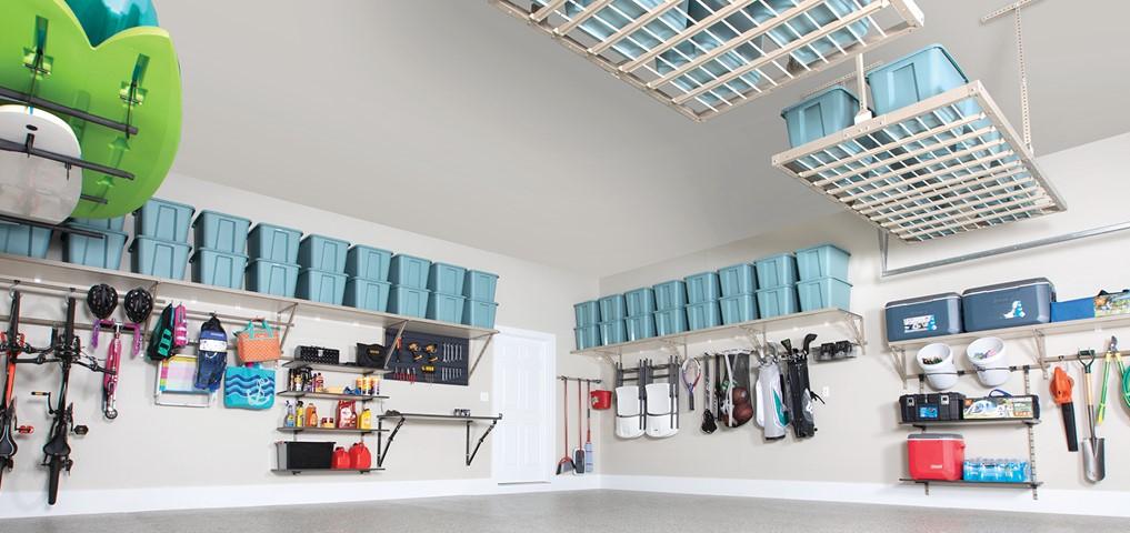 dual purpose shelving (stacking totes/ boxes/coolers) and adjustable hanging (bikes, yard tools, bag/folding chairs, scooters, strollers, golf bags, cornhole boards, ladders), ceiling mounted overhead platforms both fixed and motorized so you don’t need a ladder. Great for clients with tall ceiling heights.