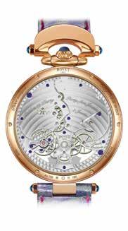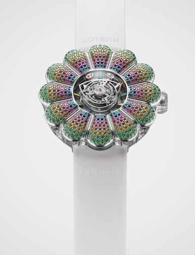 model Quirky Tourbillon 48mm dengan emas putih dan berlian mereka yang elegan, casing berukuran besar dengan pelat jam kerangka dan berlian berkilauan itu sungguh menarik. Yang juga unik adalah koleksi Crystal 46mm dalam warna-warni cerah yang mengusung mesin jam otomatis yang dapat dilihat melalui pelat jam transparan. Transparansi memang merupakan protagonis utama dari koleksi Crystal mereka, dan aspek-aspek yang menghiasi casing jam meningkatkan efek cahaya yang menakjubkan. Tali berbahan silikon juga menunjukkan efek transparan tertentu, sesuai dengan konsep desain koleksi ini, dan dilengkapi gesper kupu-kupu.