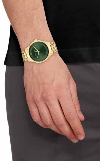 Model mengenakan jam tangan Crystal 46mm dari Gaga Milano; Roulette Master II dari Romago; Bagian belakang case Roulette Master Romago dari rose gold; Dua versi lain Crystal 46mm dari Gaga Milano yang unik, terbuat dari kaca K9 superior berbentuk cembung, dan tali jam dari silikon hipoalergenik