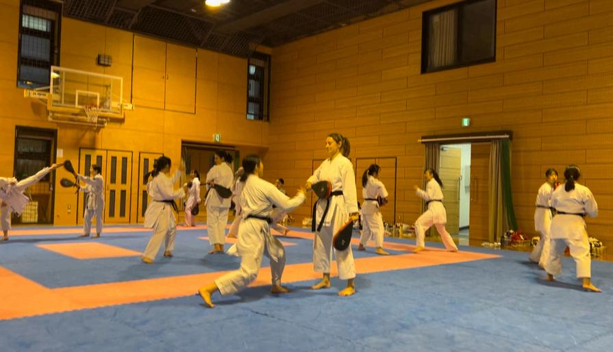 After returning to Osaka, we joined the OIT Karate Club for a practice in their dojo. The students led a warm-up and focused on speed footwork drills for kumite. Then, Takahashi Sensei led a set of drills focused on kihon and pad work. We got to practice kizami zuki, gyaku zuki, and mawashi geri against pads to practice our distancing and impact training. At night, we went to a local izakaya to enjoy one final dinner with our Osaka area friends before departing for Tokyo.