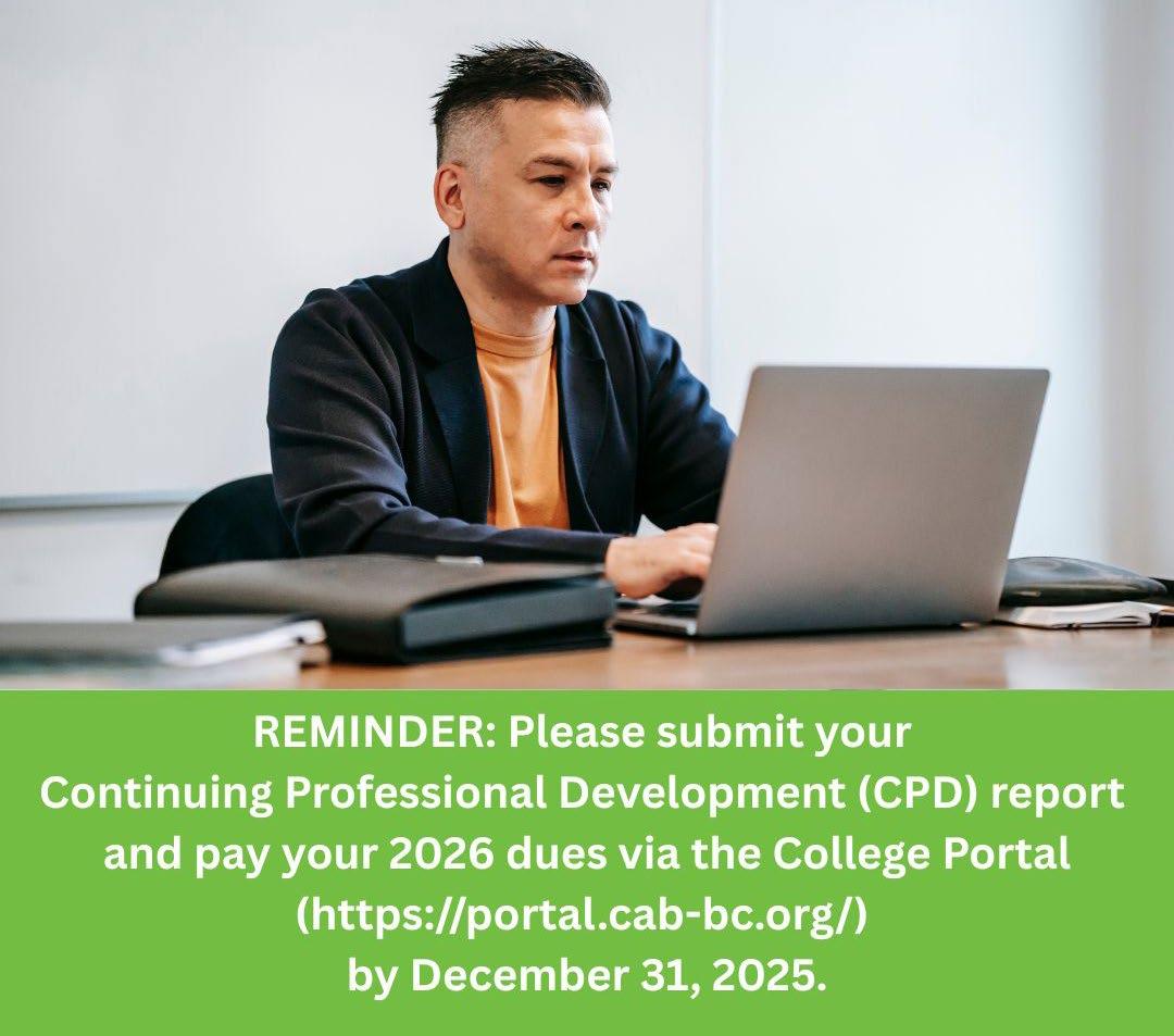 If you’re interested in contributing to College Matters, contact the College at cab@cab-bc.org with your proposed topic. Submissions that are printed in an issue of College Matters can be claimed for Continuing Professional Development points!