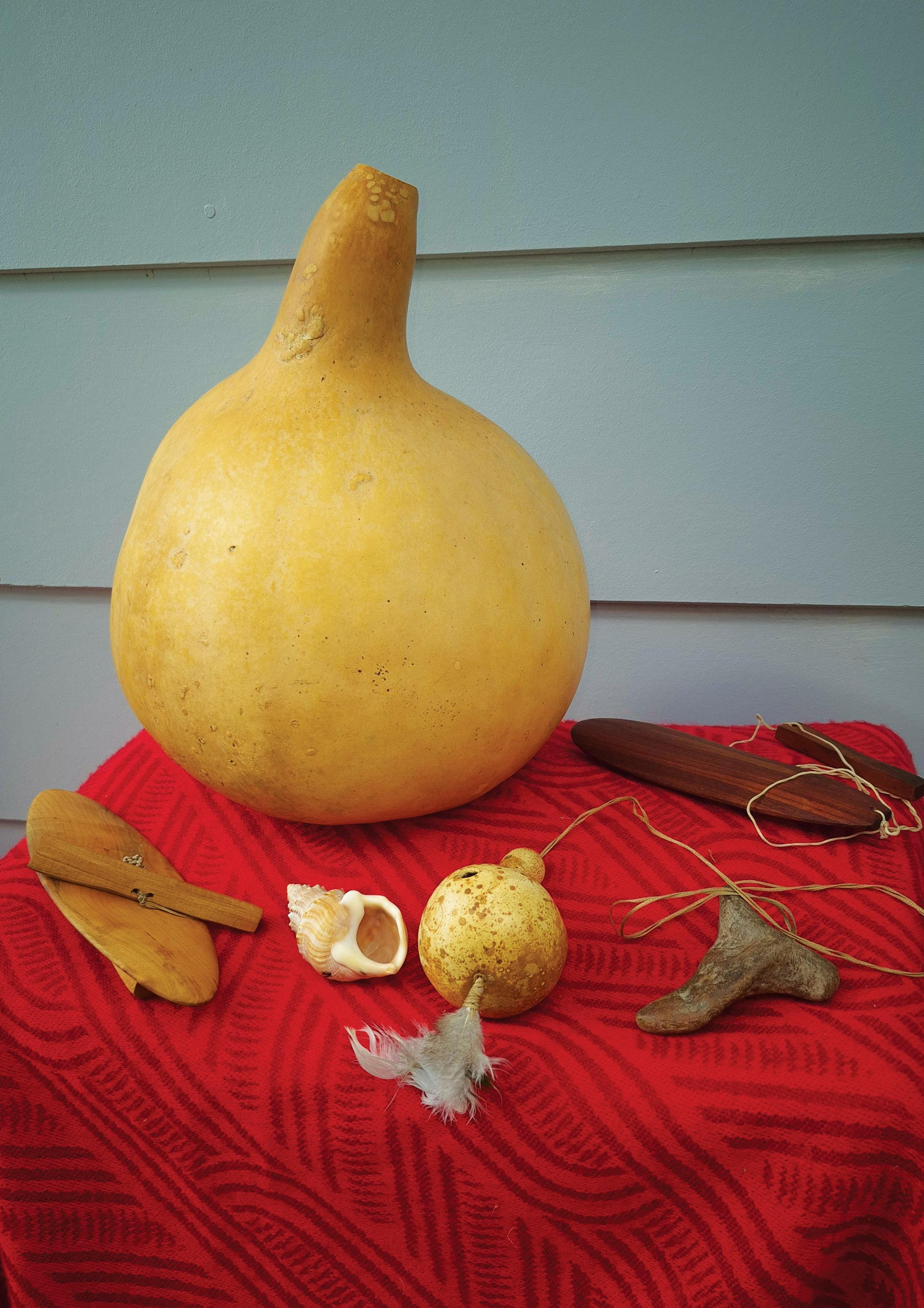 Each taonga pūoro carries the essence of an atua. Hine Pū Te Hue, the goddess of peace, is embodied in the puruhau, made from a hue (gourd), and supporting slow, rhythmic breathing. The hue poi awhiowhio, a birdcaller, clears energy and brings the sounds of the ngahere into the room.