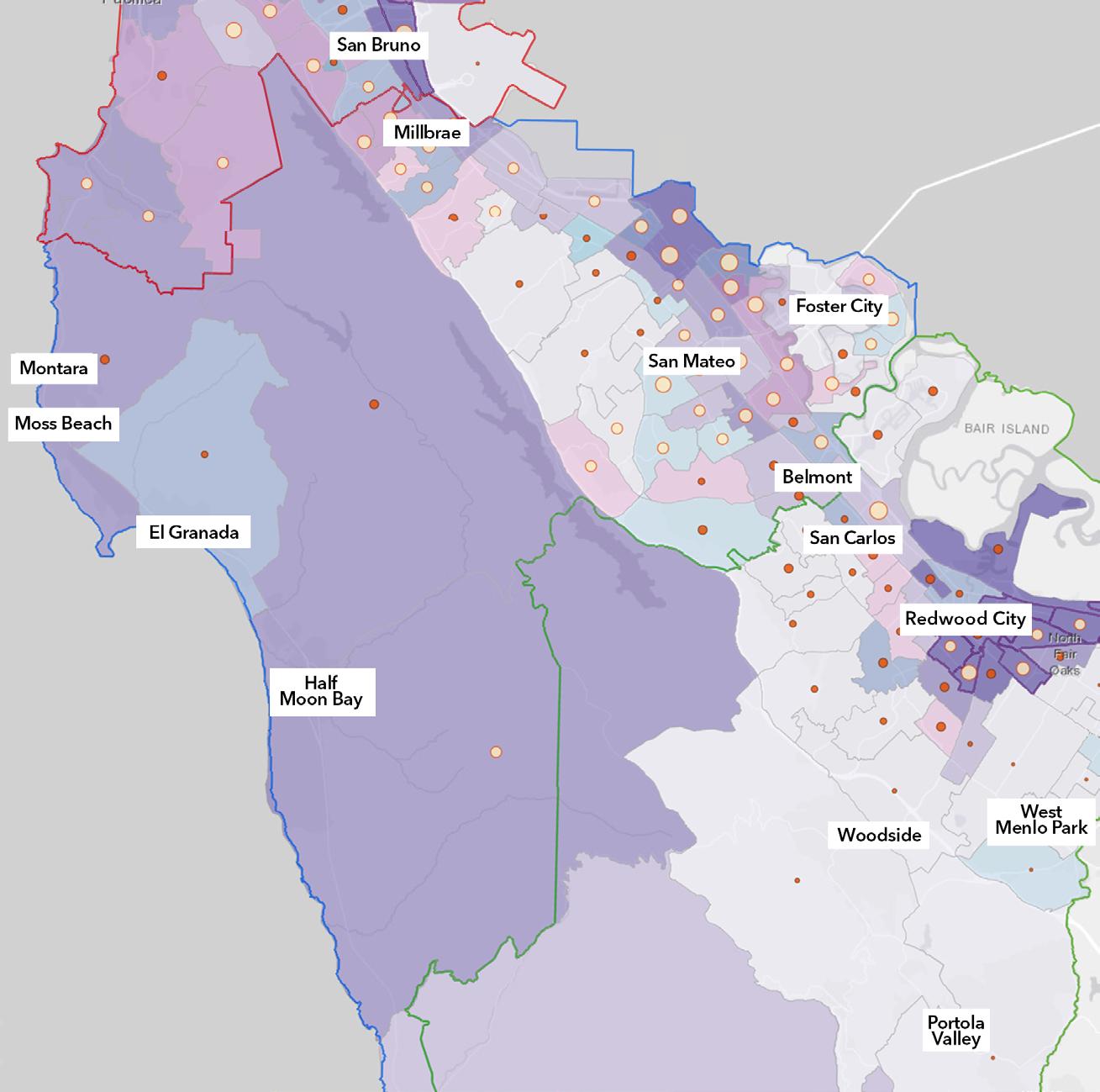 This map tells us where we’ve had success in reaching out and enrolling students from under-resourced San Mateo neighborhoods such as Los Prados, North Central, Central, North Shoreview and South Shoreview . We have had success attracting students from these areas and need to ensure that we have support services in place to retain them .