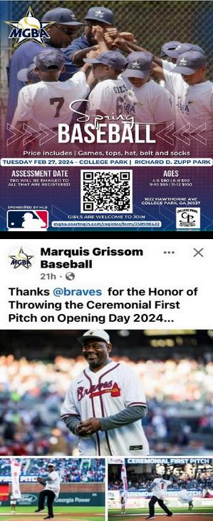 On April 5, 2024, former Atlanta Braves centerfielder and World Series Marquis Grissom, MGBA founder, was honored in throwing out the ceremonial first pitch on opening day at Truist Park. Marquis is such an amazing support for the youth on the southside of Atlanta and the community and College Park are proud to collaborate the MGBA programming in the City of College Park.