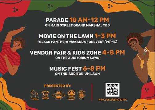 The City of College Park will host its first annual Juneteenth on Wednesday, June 19th. The event day outline will include a parade down Main Street starting at Truist Bank, starting at 10:00 am and ending approximately at 12:00 pm at the Subway on Main Street. Following the parade will be a movie on the Auditorium lawn from 1:00 pm - 3:00 pm, featuring the movie “Black Panther: Wakanda Forever”. From 4:00 pm - 8:00 pm will be a Vendor Fair and Kids’ Zone. Ending the day will be Music on the Lawn from 6:00 pm - 8:00 pm featuring New South Playaz. We invite all to come out and join in the parade and the festivities to bring the community together for this citywide event.