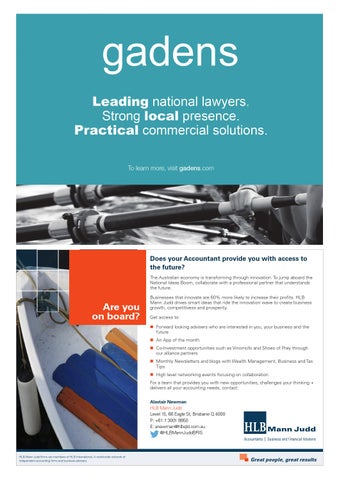 Businesses that innovate are 60% more likely to increase their profits. HLB Mann Judd drives smart ideas that ride the innovation wave to create business growth, competitivess and prosperity. Get access to: Forward looking advisers who are interested in you, your business and the future An App of the month Co-Investment opportunities such as Vinomofo and Shoes of Prey through our alliance partners Monthly Newsletters and blogs with Wealth Management, Business and Tax Tips High level networking events focusing on collaboration For a team that provides you with new opportunities, challenges your thinking + delivers all your accounting needs, contact: Alastair Newman HLB Mann Judd Level 15, 66 Eagle St, Brisbane Q 4000 P: +61 7 3001 8850 E: anewman@hlbqld.com.au @HLBMannJuddBRIS