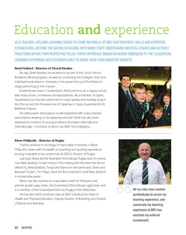 Education and experience As a teacher, lifelong learning seems to come naturally. At BBC our teachers’ skills and expertise expands well beyond the bachelor DEGREE with many staff undertaking masters studies and actively practising within their respective fields. Their experience brings an added dimension to the classroom learning experience with students able to draw upon their industry insights. Brett Holland - Director of Choral Studies By day, Brett teaches choral lessons as part of the Junior School Academic Music program, as well as conducting the College’s choir and individual vocal lessons. However, in his spare time you’ll find Brett on stage performing to the masses. A well-known bass in Queensland, Brett performs as a regular soloist with many choirs, orchestras and associations. As a member of Opera Queensland, he has also performed in many operas and recently sung in the Chorus and the Principal role of Caiaphas in Opera Queensland’s St Matthew Passion. His enthusiasm and passion is well respected with many industry associations drawing on his expertise and skill. Brett has also been selected as a mentor for young professional singers nationally and internationally – a number of whom are BBC Old Collegians.