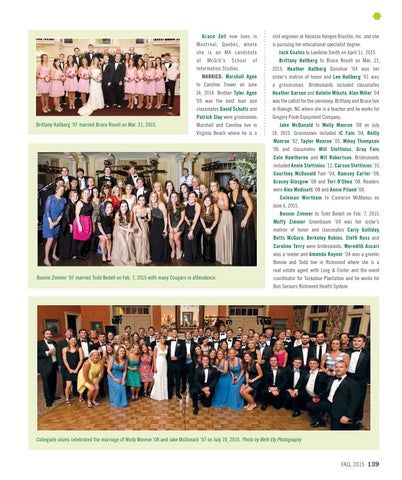 civil engineer at Vanasse Hangen Brustlin, Inc. and she is pursuing her educational specialist degree. Jack Coates to LeeAnne Smith on April 11, 2015. Brittany Hallberg to Bruce Rosell on Mar. 21, 2015. Heather Hallberg Donohue ’04 was her sister’s matron of honor and Lee Hallberg ’01 was a groomsman. Bridesmaids included classmates Heather Garson and Katelin Mikuta. Alan Miller ’04 was the cellist for the ceremony. Brittany and Bruce live in Raleigh, NC where she is a teacher and he works for Gregory Poole Equipment Company. Jake McDonald to Molly Monroe ’08 on July 19, 2015. Groomsmen included JC Fain ’04, Reilly Monroe ’02, Taylor Monroe ’05, Mikey Thompson ’06 and classmates Will Stettinius, Gray Fain, Cole Hawthorne and Wit Robertson. Bridesmaids included Annie Stettinius ’12, Carson Stettinius ’10, Courtney McDonald Fain ’04, Ramsey Carter ’08, Gracey Glasgow ’08 and Tori O’Shea ’08. Readers were Alex Modisett ’08 and Annie Piland ’08. Coleman Wortham to Cameron McManus on June 6, 2015. Bonnie Zimmer to Todd Bedell on Feb. 7, 2015. Muffy Zimmer Greenbaum ’04 was her sister’s matron of honor and classmates Carly Golliday, Betts McGurn, Berkeley Robins, Steffi Ross and Caroline Terry were bridesmaids. Meredith Ascari was a reader and Amanda Rayner ’04 was a greeter. Bonnie and Todd live in Richmond where she is a real estate agent with Long & Foster and the event coordinator for Tuckahoe Plantation and he works for Bon Secours Richmond Health System.