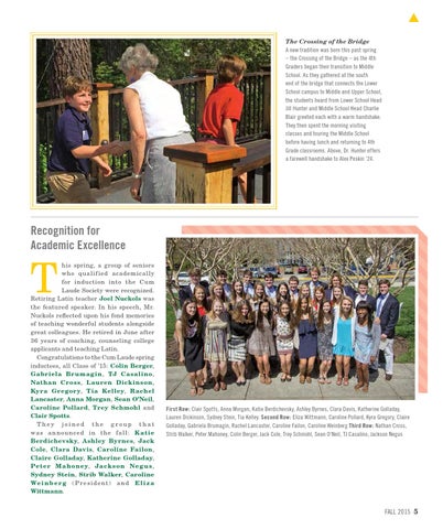 his spring, a group of seniors who qualif ied academically for induction into the Cum Laude Society were recognized. Retiring Latin teacher Joel Nuckols was the featured speaker. In his speech, Mr. Nuckols reflected upon his fond memories of teaching wonderful students alongside great colleagues. He retired in June after 36 years of coaching, counseling college applicants and teaching Latin. Congratulations to the Cum Laude spring inductees, all Class of ’15: Colin Berger, Gabriela Br umag in, TJ Casalino, Nathan Cross, Lauren Dickinson, Kyra Gregory, Tia Kelley, Rachel Lancaster, Anna Morgan, Sean O’Neil, Caroline Pollard, Trey Schmohl and Clair Spotts. T hey joined the g roup that wa s a n nou nc e d i n t he fa l l : K at ie Berdichevsky, Ashley Byrnes, Jack Cole, Clara Davis, Caroline Failon, Claire Golladay, Katherine Golladay, Pet er M a honey, Jack s on Neg u s, Sydney Stein, Strib Walker, Caroline We i n b e r g ( P r e s i d e nt ) a n d E l i z a Wittmann.