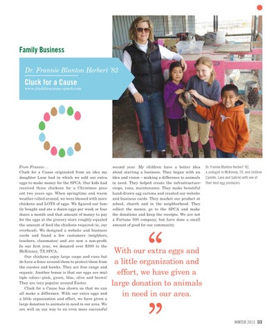 second year. My children have a better idea about starting a business. They began with an idea and vision – making a difference to animals in need. They helped create the infrastructurecoops, runs, maintenance. They make beautiful hand-drawn egg cartons and created our website and business cards. They market our product at school, church and in the neighborhood. They collect the money, go to the SPCA and make the donations and keep the receipts. We are not a Fortune 500 company, but have done a small amount of good for our community.