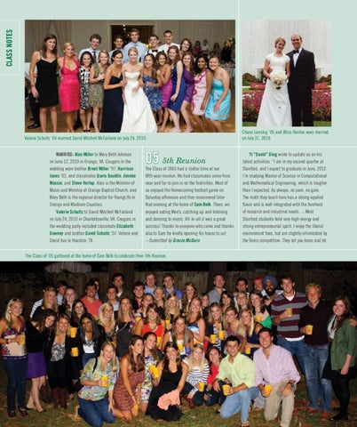 CLASS NOTES Valerie Schultz ’04 married David Mitchell McFarland on July 24, 2010. MARRIED: Alan Miller to Mary Beth Johnson on June 12, 2010 in Orange, VA. Cougars in the wedding were brother Brent Miller ’97, Harrison Jones ’03, and classmates Davis Gouldin, Jimmie Massie, and Steve Vorlop. Alan is the Minister of Music and Worship at Orange Baptist Church, and Mary Beth is the regional director for YoungLife in Orange and Madison Counties. Valerie Schultz to David Mitchell McFarland on July 24, 2010 in Charlottesville, VA. Cougars in the wedding party included classmate Elizabeth Downey and brother David Schultz ’07. Valerie and David live in Houston, TX.