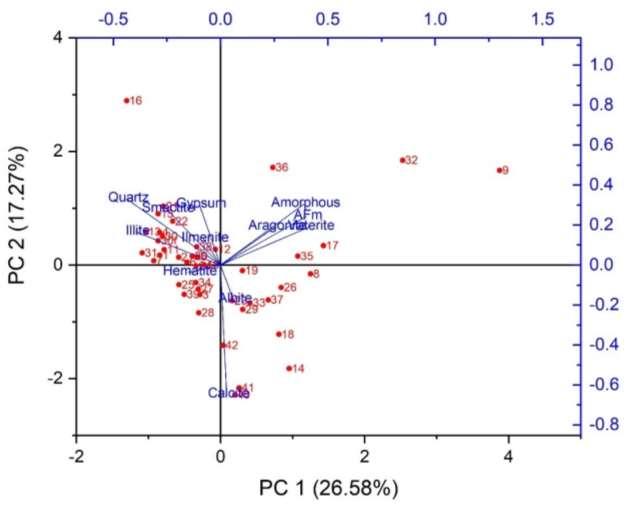 Biplot relativo alle componenti principali dei profili mineralogici analizzati