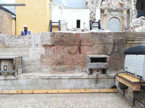 La demolizione del timpano e del portico delle Misure a seguito del sisma del 1859 [foto SABAP Umbria]