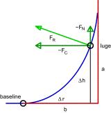 FW=mg drag Fd =½ρ Cd A v2 surface reaction force Fr friction Ff =µ FR . The luge is accelerated by the projection of the weight on the trajectory FP =mg·sinα. In straights the surface reaction force is given by FR =FN with FN =mg·cosα.